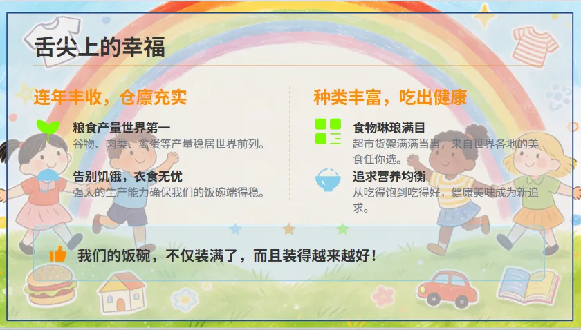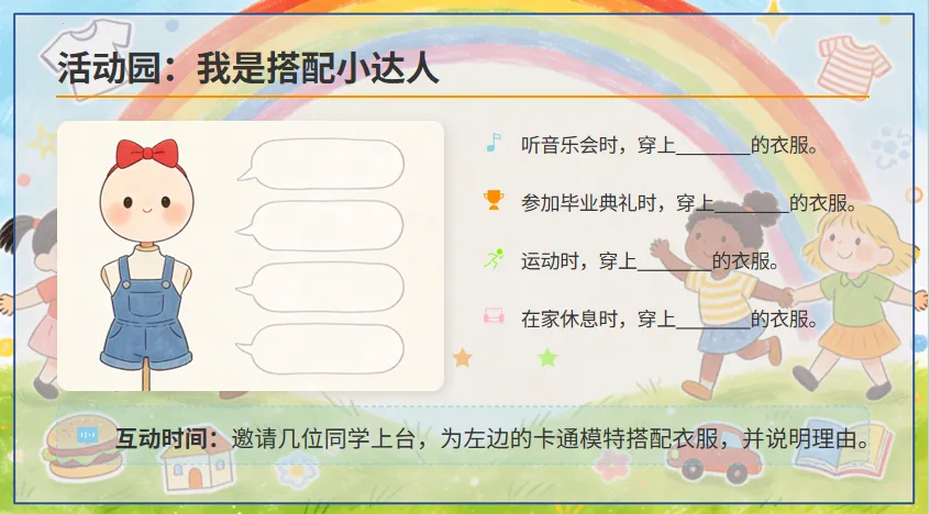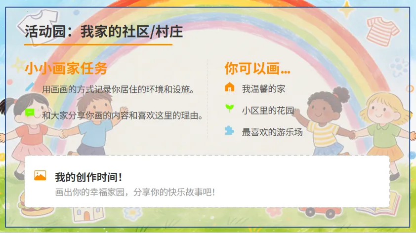 2.积极参与“搭配小达人”“家乡美食推荐官”“幸福家园绘画” 等互动活动,主动分享自身经历和感受,在实践中深化对 “幸福生活” 的理解,增强表达与合作能力。