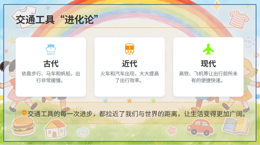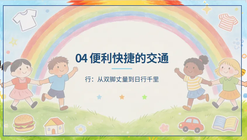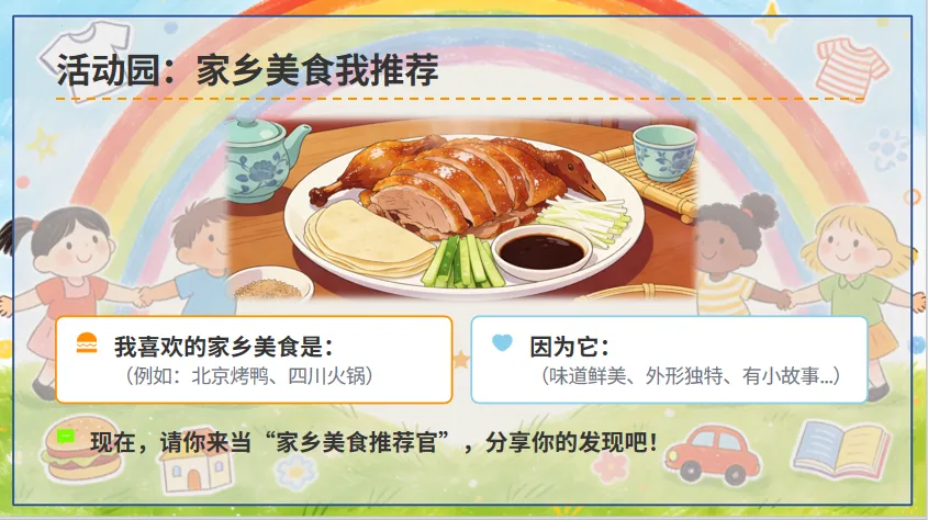 3.活动材料:每人 1 张绘画纸、1 套彩笔,每组 1 张 “交通变迁调查表格”“家乡美食推荐卡”,若干贴纸(用于活动评价)。
