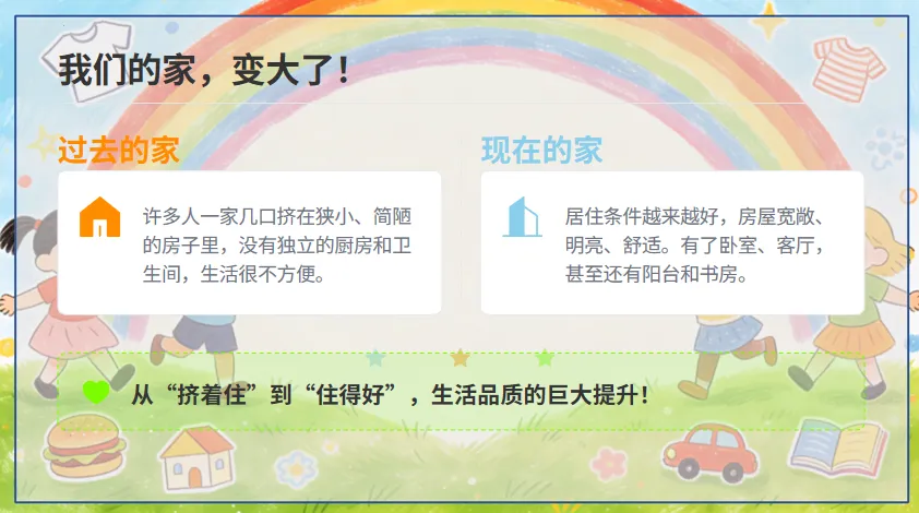 1.理解生活变化背后的社会发展支撑,如粮食产量提升、交通工程建设、文化惠民政策等,避免仅停留在表面现象感知,引导学生初步建立“生活变化离不开社会进步” 的认知。