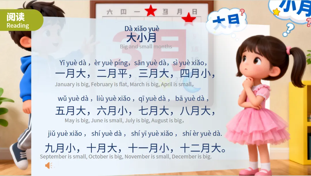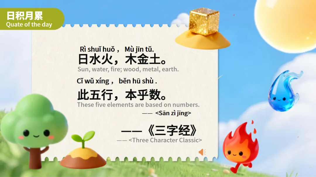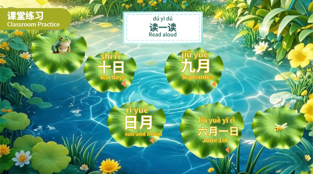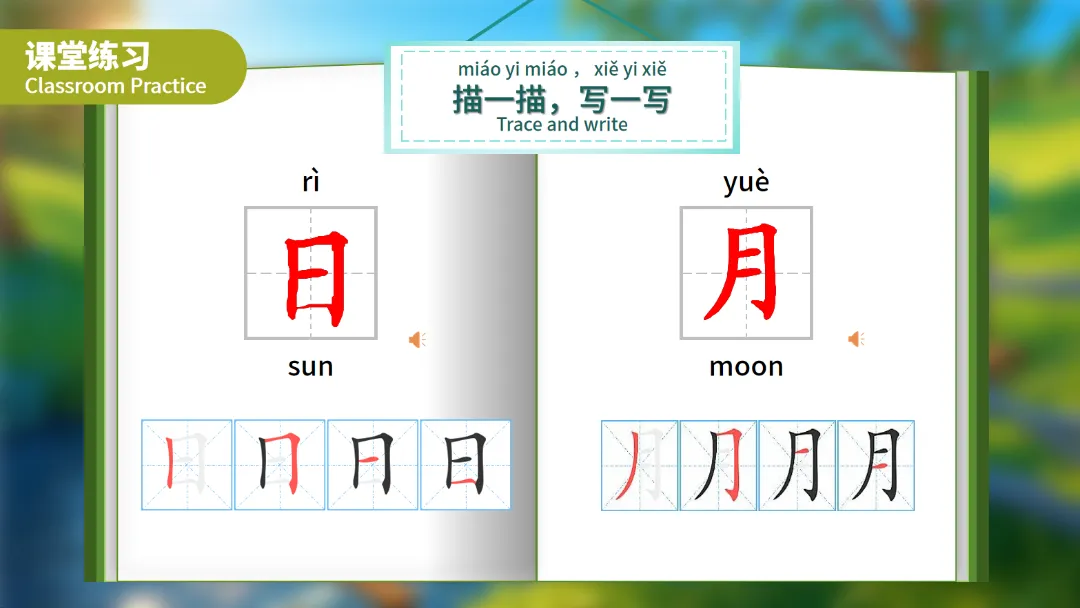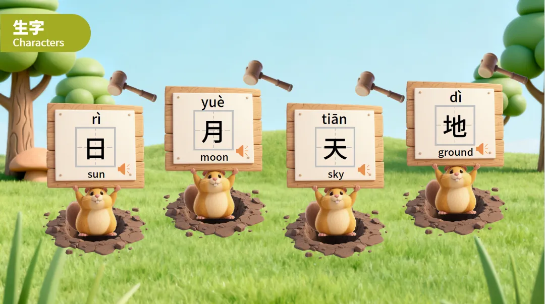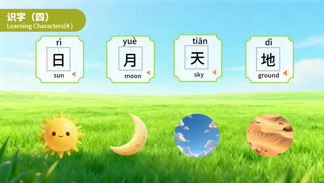 本课聚焦四个基础汉字:日、月、天、地,每个字都配有清晰的拼音、英文释义和直观的图像对应,让学生一眼看懂字形与含义的关联: