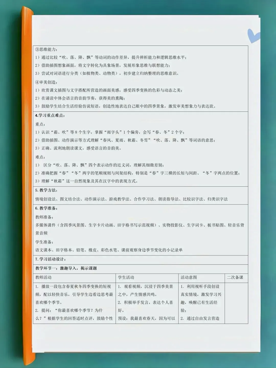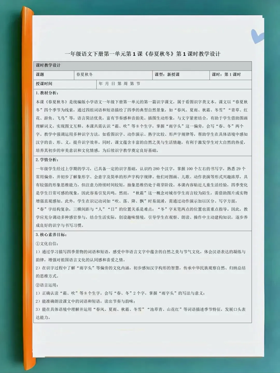 📖新课标核心素养教案✅ 文化自信・语言运用・思维能力・审美创造✅ 分课时设计:目标 + 重难点 + 流程 + 板书 + 作业 + 反思✅ 低龄友好,识字、朗读、写字梯度清晰✅ 可编辑可打印,检查 / 公开课直接用