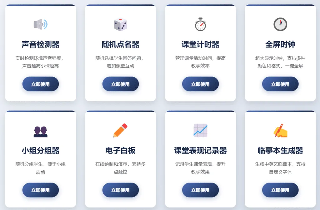 教师工具箱 v1.3 的核心价值在于其丰富的功能集成。声音检测器可实时监测课堂环境声音强度,帮助维持自习课秩序;全屏时钟让时间展示更加清晰,适合课堂限时任务;随机点名器公平随机选择学生,增加课堂参与度和互动性;课堂计时器精确管理活动时间,支持全屏显示,让学生对剩余时间一目了然[citation:1]。