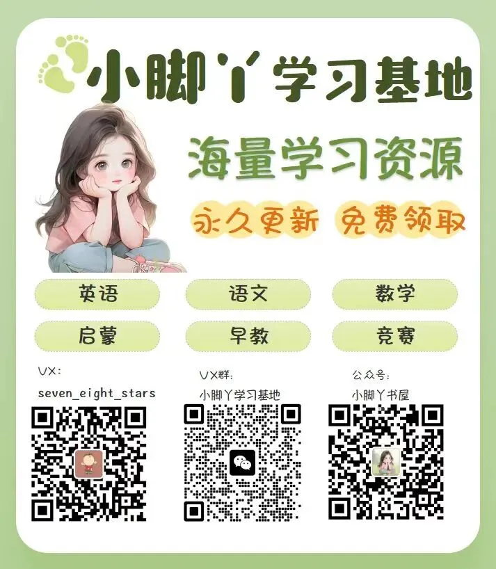 Hi!你好,这里是小脚丫书屋,很高兴与你在这里相遇。以后,我会在这里更新1-12岁孩子学习资源,鼓励孩子们坚持阅读📖帮助孩子点滴成长。