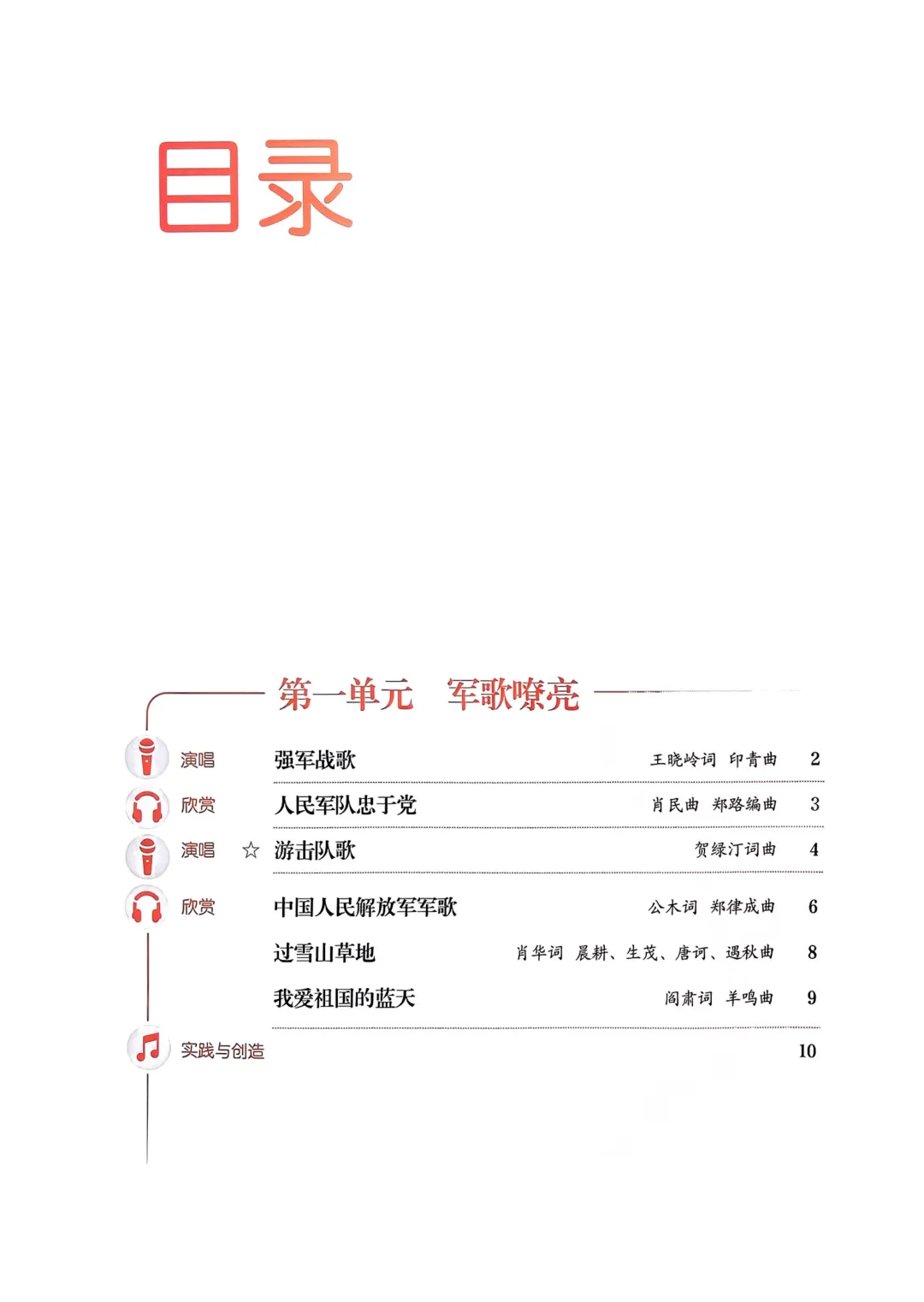 3 | 1 | 第一单元军歌嘹亮 | 欣赏《中国人民解放军军歌》《过雪山草地》《我爱祖国的蓝天》;单元实践与创造 | 6-11 | 了解军歌历史沿革,感受长征精神和空军爱国情怀;分辨音乐要素与情绪的联系 | 为《游击队歌》设计不同情景的演唱方案;学唱《人民军队忠于党》 |