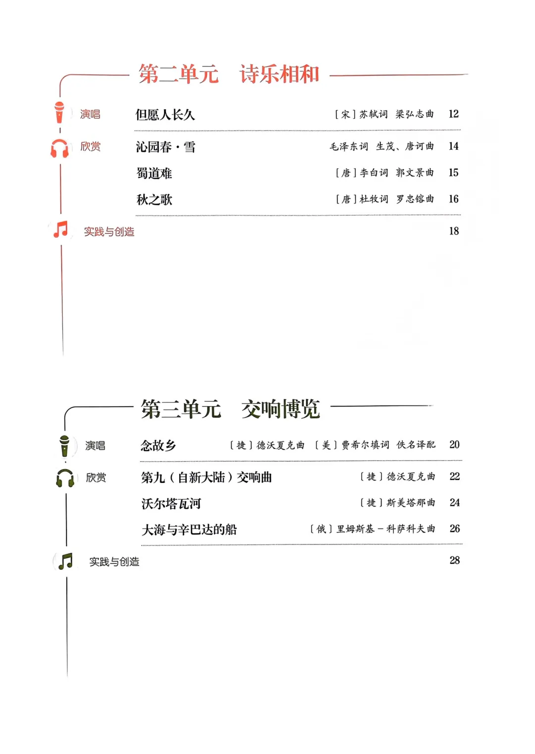 单元主题:从红色军旅音乐(军歌嘹亮)→ 古典诗乐融合(诗乐相和)→ 欧洲经典交响(交响博览)→ 美洲多元乐声(美洲乐声)→ 中国传统器乐(国乐飘香二)→ 民族精神传承(中国精神),由浅入深、由中到外,形成 “文化传承 + 世界视野” 的教学脉络。