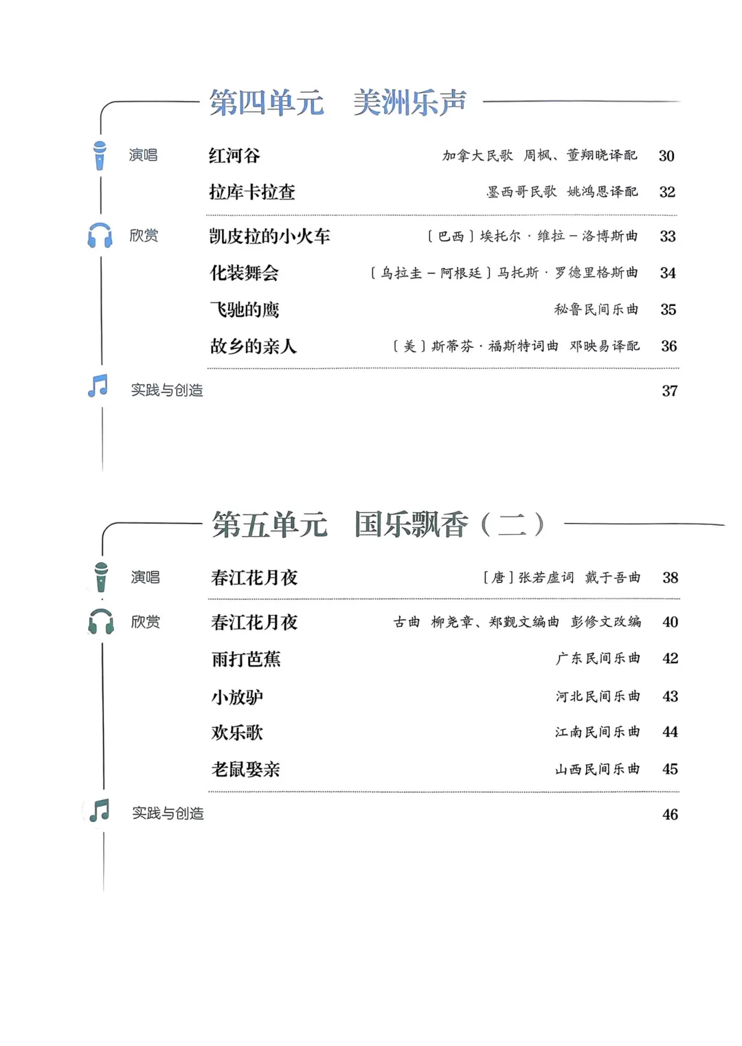 文化理解:了解本册作品的创作背景、历史文化内涵,认识贺绿汀、冼星海、德沃夏克、斯美塔那等10 余位中外音乐家的艺术成就;理解中国红色音乐、传统民乐与地域文化、时代精神的联系,感受欧洲民族乐派、美洲民间音乐的文化特色;掌握 “换头合尾”“放慢加花” 等中国传统音乐创作手法,增强文化自信和跨文化包容意识。