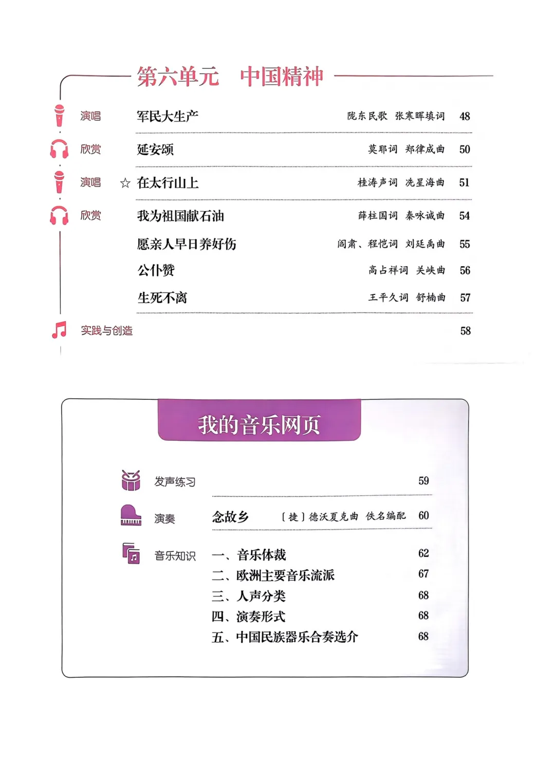 16 | 1 | 第六单元中国精神 | 欣赏《延安颂》《我为祖国献石油》《愿亲人早日养好伤》《公仆赞》《生死不离》;单元实践与创造 | 50、54-58 | 理解中国精神在不同历史时期的体现;感受音乐的文化载体作用 | 搜集体现中国精神的音乐作品;课堂演唱展示 |