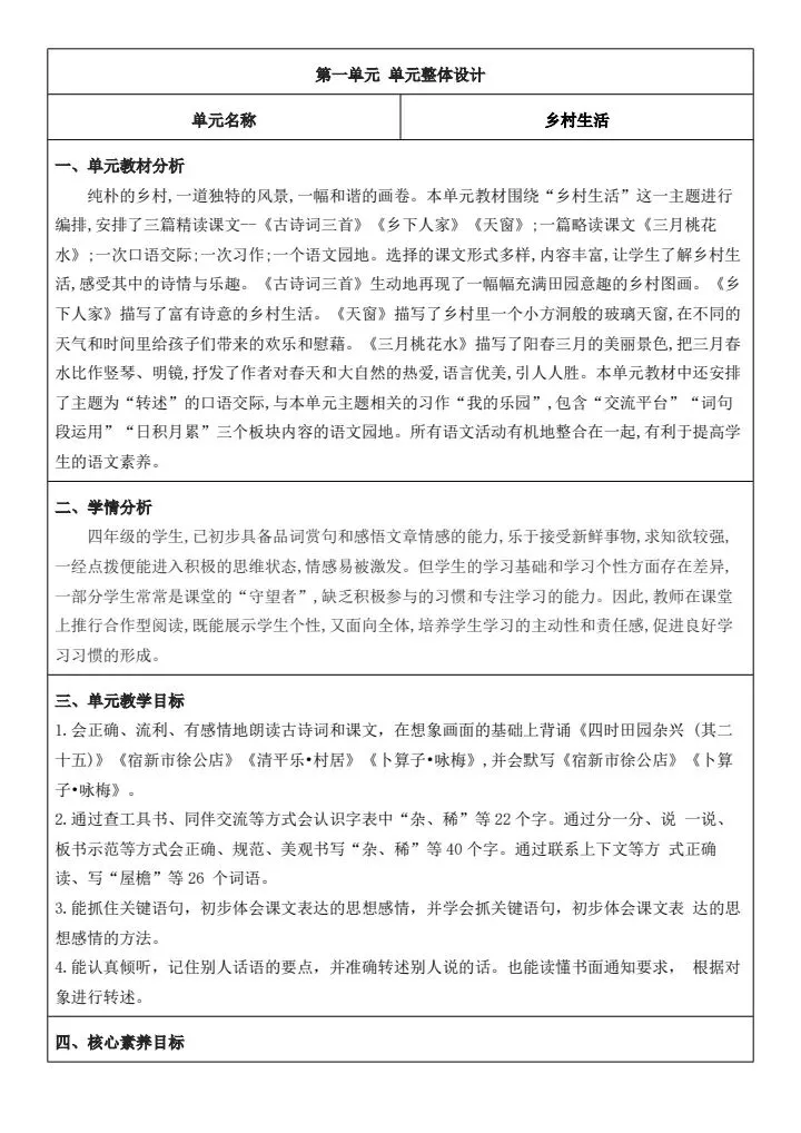 >四年级下册语文《全册核心素养教案(含教学反思、二次备课栏、思政元素)》word版可编辑,高清电子版可打印