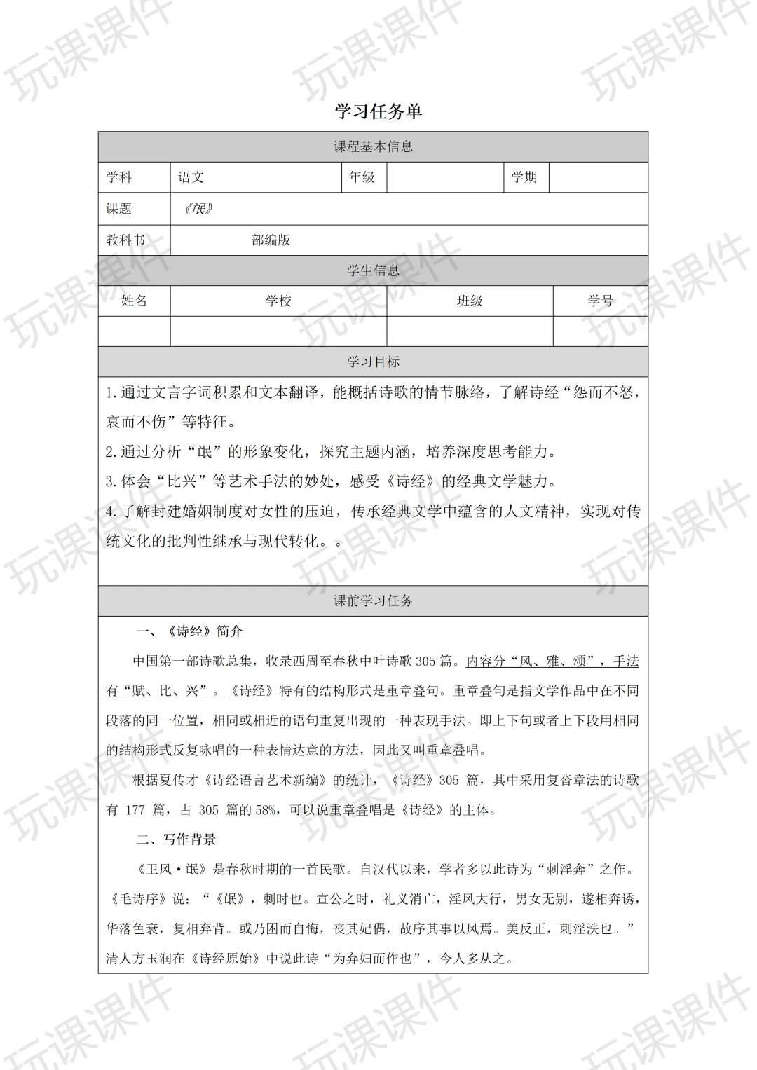 颜值与实用双在线!选必下《氓》(课件+教案+学习任务单),助力教师呈现高质量公开课课堂 | 玩课