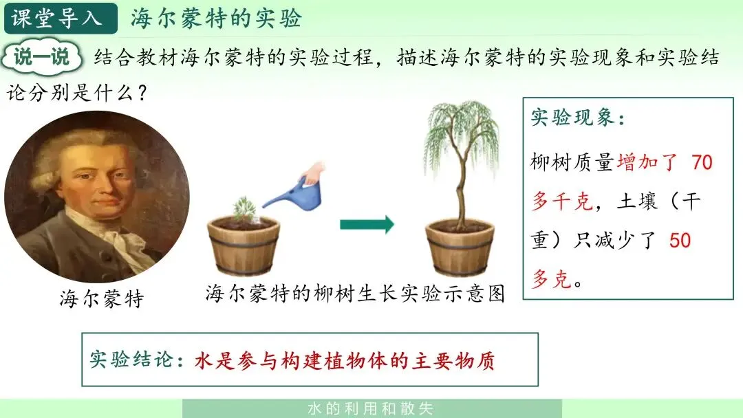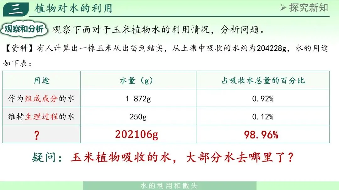这一环节我先设置一个数据或情境问题:“植物吸收了大量水,这些水是否都用于生长发育?”