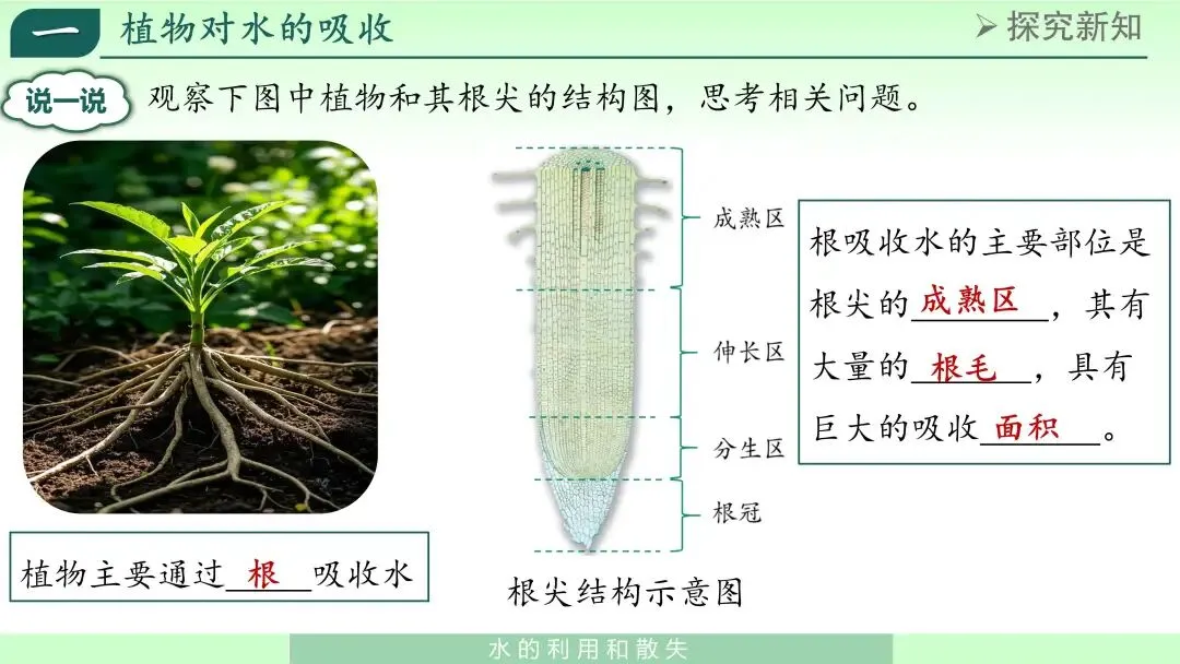 在学生观察和回答基础上,我进行归纳:植物主要通过根吸收水,主要吸水部位是根尖成熟区。成熟区分布有大量根毛,根毛能显著增大吸收面积,从而提高吸水能力。