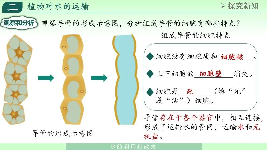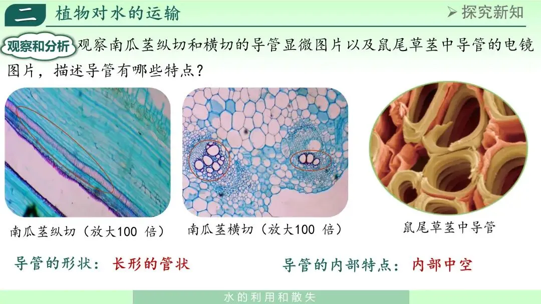 在此基础上,我引出“导管”概念,并结合图片说明:导管是植物体内运输水和无机盐的重要结构。其结构特点可以概括为:长管状、内部中空、上下连通,适合液体运输。