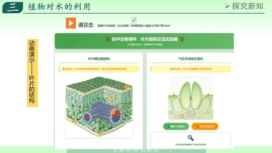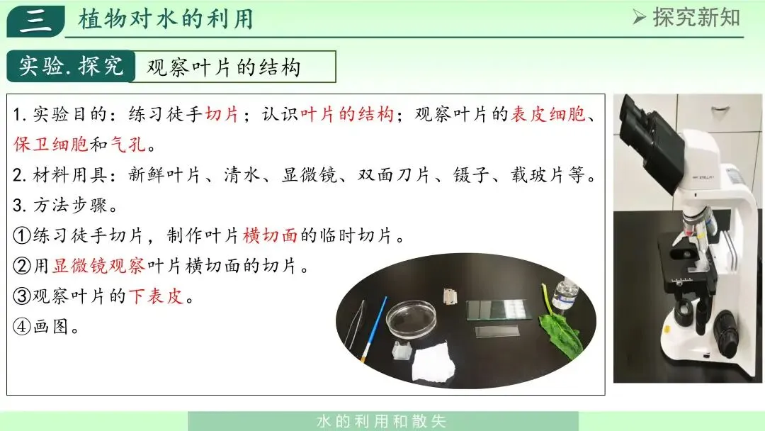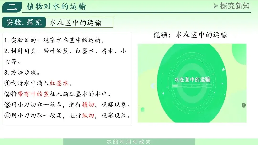 3. 实验探究法通过红墨水实验、蒸腾作用对照实验等内容,帮助学生理解植物对水的运输和散失过程,培养科学探究意识。