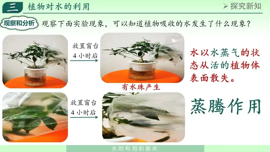 接下来,我展示枝条套塑料袋后袋内出现小水珠的现象,并提问:“这些水珠从哪里来?”在学生讨论后,我总结:植物体内的水可以以水蒸气形式散失到空气中,这一过程叫作蒸腾作用。
