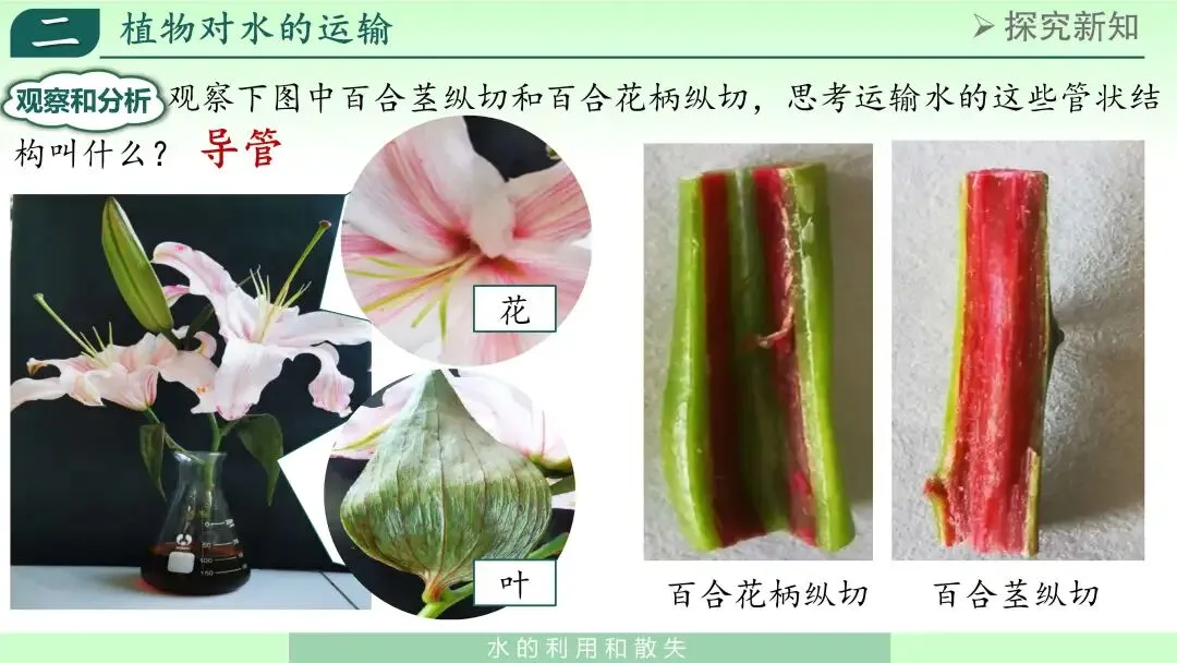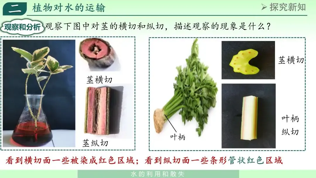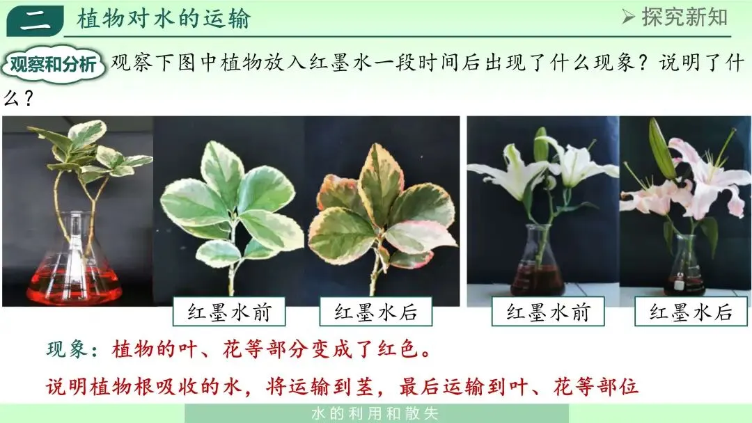 “为什么上部器官会出现颜色变化?”通过讨论,学生可以得出初步结论:根或枝条吸收的水能够在植物体内向上运输。
