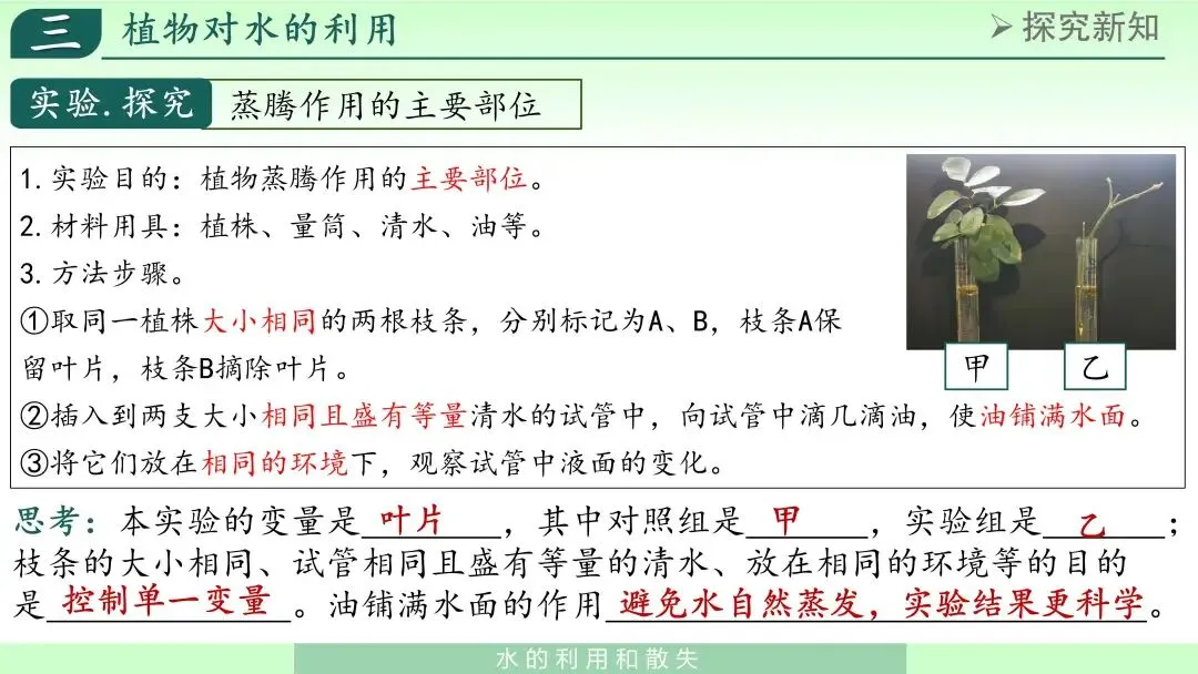 为了帮助学生得出结论,我引入对照实验:设置一组保留叶片,一组去除叶片,并控制其他条件一致(如试管水面滴油,防止水面直接蒸发),观察液面变化或失水差异。
