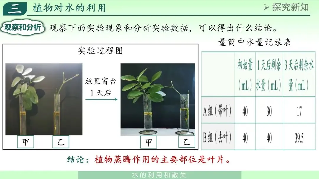 我会在这里强调对照实验的思想:本实验中控制单一变量(叶片有无),使结论更可靠。这样既学习知识,也渗透科学探究方法。