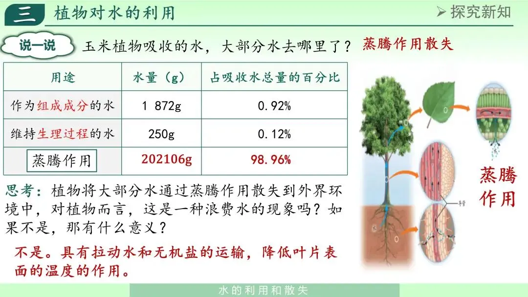 学生通常会出现不同观点。我会组织简短讨论后归纳蒸腾作用的意义: