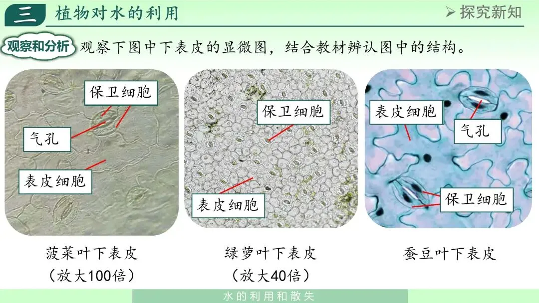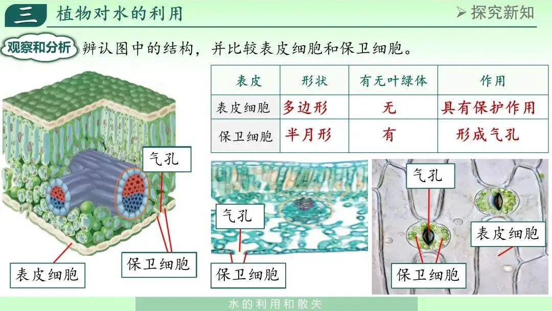 通过比较,学生能认识到:保卫细胞位于气孔两侧,形态特殊,是控制气孔开闭的关键结构。