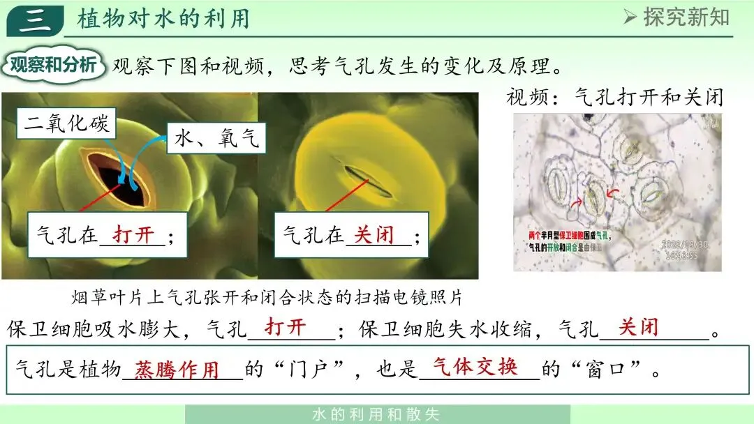 在此基础上,我结合示意图讲解:当保卫细胞吸水膨胀时,气孔张开;当保卫细胞失水收缩时,气孔关闭。因此,气孔是植物蒸腾作用水分散失的重要通道,也是气体交换的重要门户。