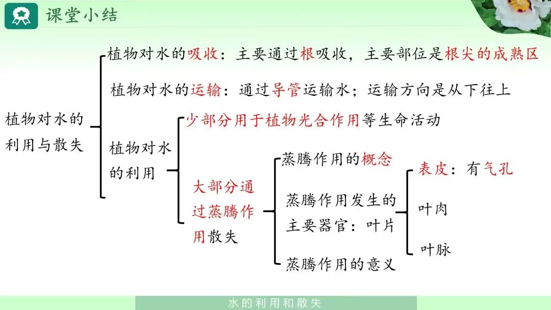 然后请学生用一句完整的话描述本节课所学内容,例如:“植物主要通过根尖成熟区吸收水,水经导管运输到各器官,其中大部分通过叶片上的气孔以蒸腾作用形式散失。”