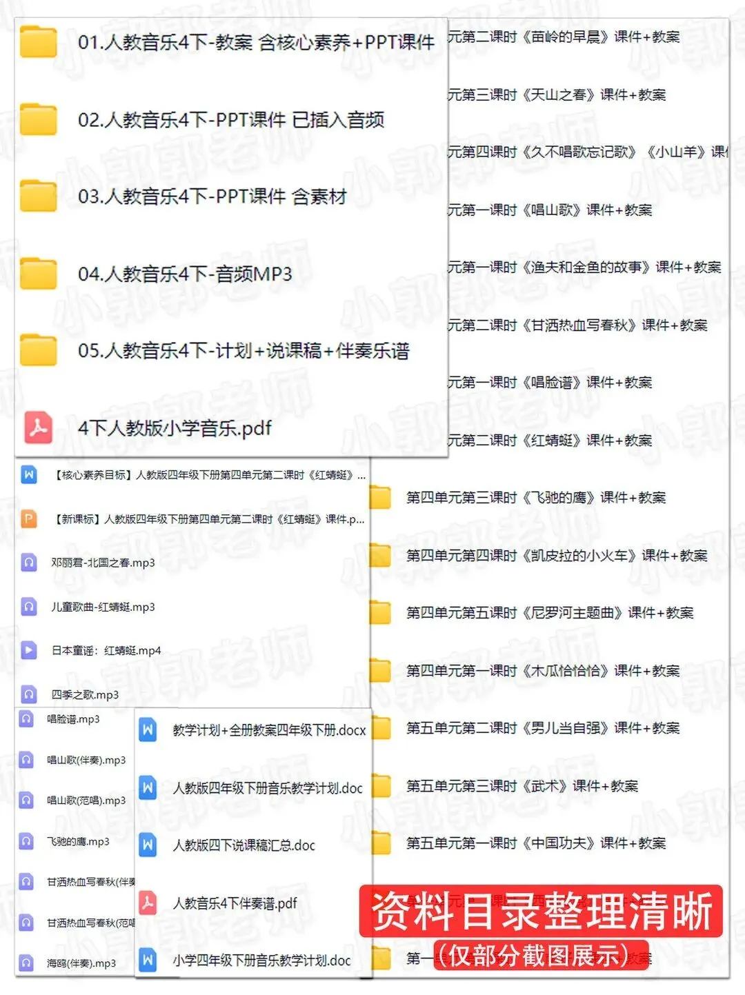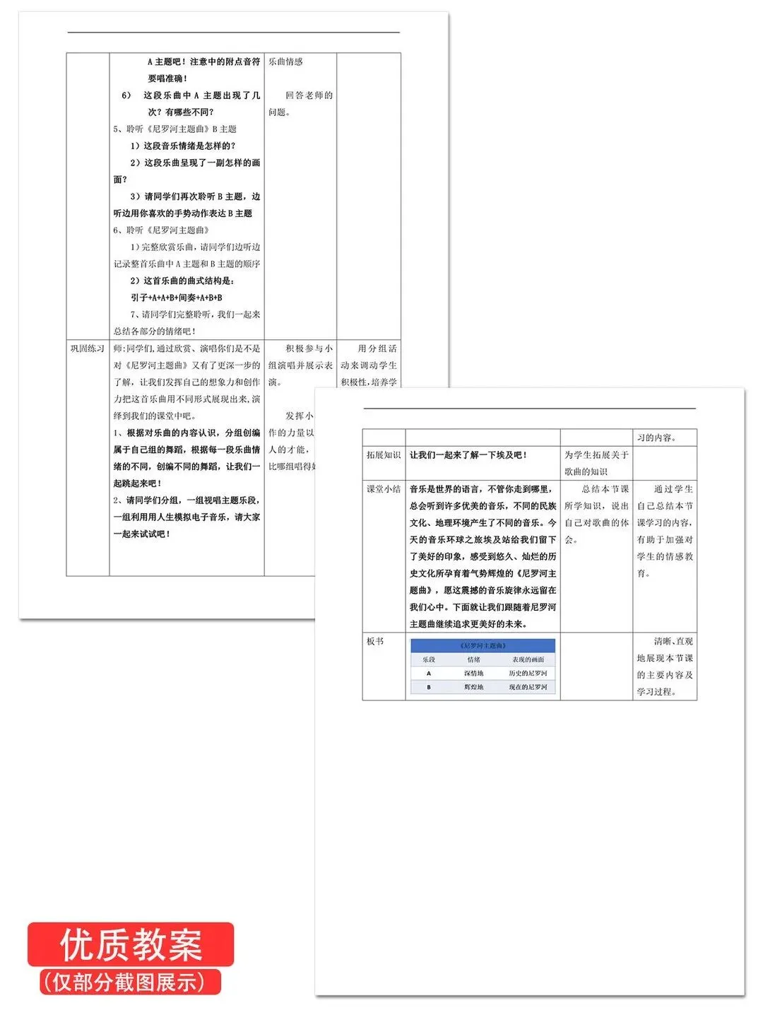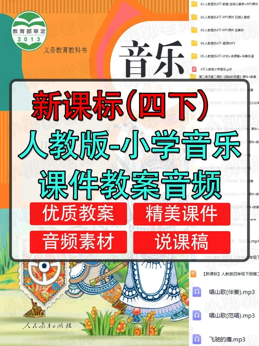 新课标教案丨多套精选 紧扣核心素养设计,教学目标/过程/评价全拆解,教学再不发愁! 高颜值课件丨多风格可选 PPT动态谱+情景动画,一秒抓住学生眼球,配套板书设计直接抄作业 沉浸式教学素材包 每课配原声音频+拓展资源,摇篮曲教学有示范演唱,回声练习有环境音效,营造剧场级课堂氛围~ 提效工具二件套 ️学期教学进度表 ️全册说课稿 再也不用加班写计划,教研组直夸专业! 本文内容来源于网络 版权归原作者所有、如有侵权,联系删除