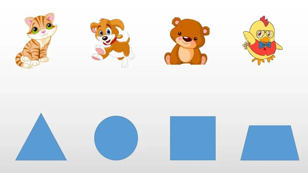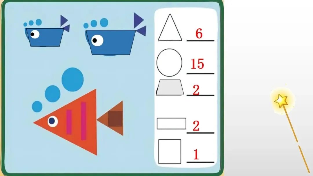 老师总结:圆形:圆溜溜,没有角,滚来滚去真能跑;三角形:三条边,三个角,像座小山立得牢;正方形:四条边一样长,四个角一样大,方方正正本领好。梯形:四条边、四个角,上下两条边平平的、两边斜斜的,四个角还不一样大,像滑梯一样。