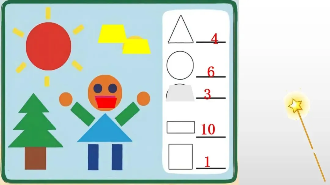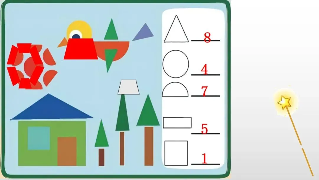 教师用魔法棒“变”出由圆形、三角形、正方形、梯形组成的图片,请幼儿找出其中的图形宝宝,并数数每种图形有几个?