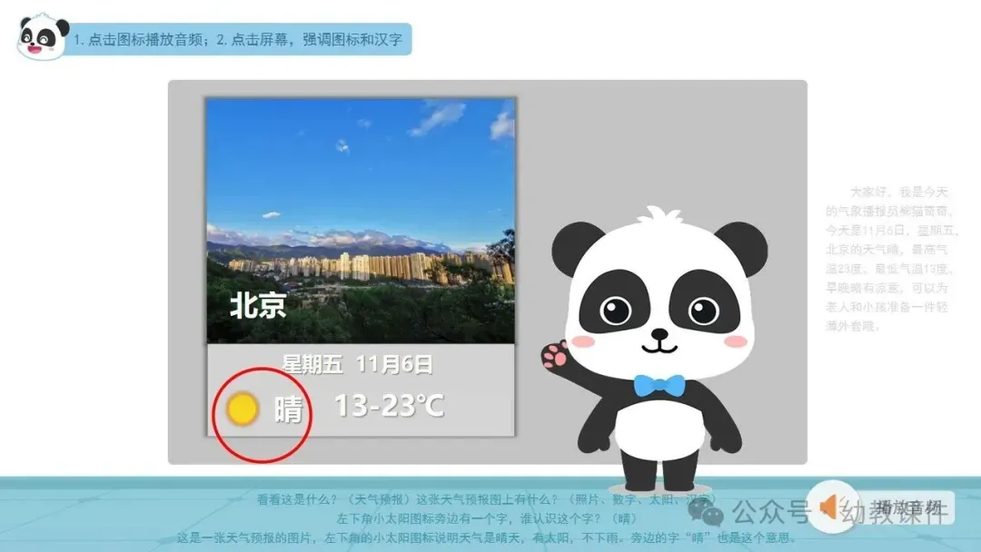 1.播放音频并出示图片“天气预报-1”,激发幼儿学习汉字的兴趣。