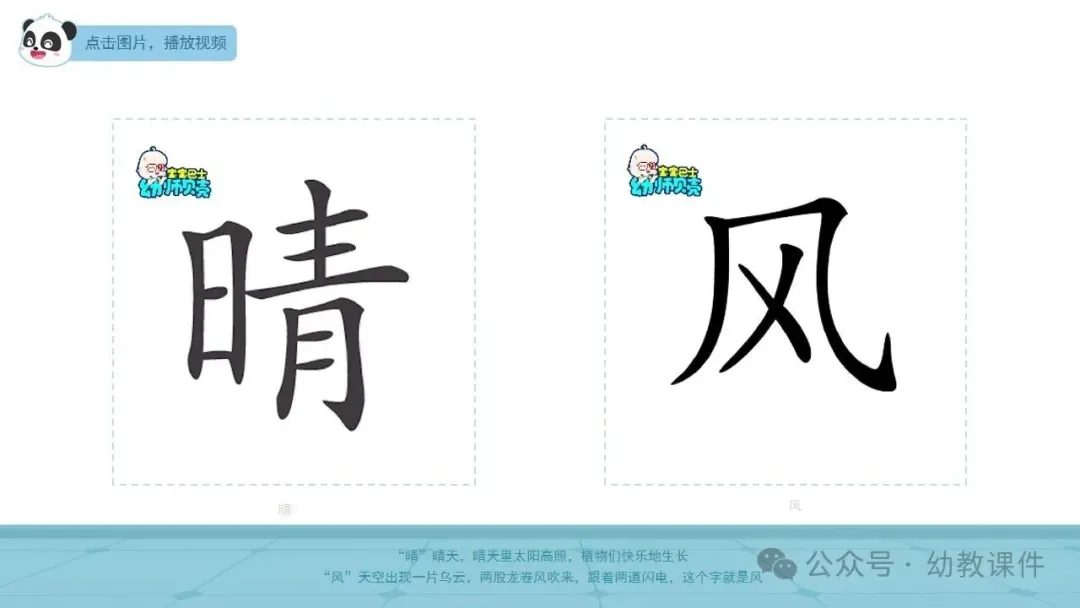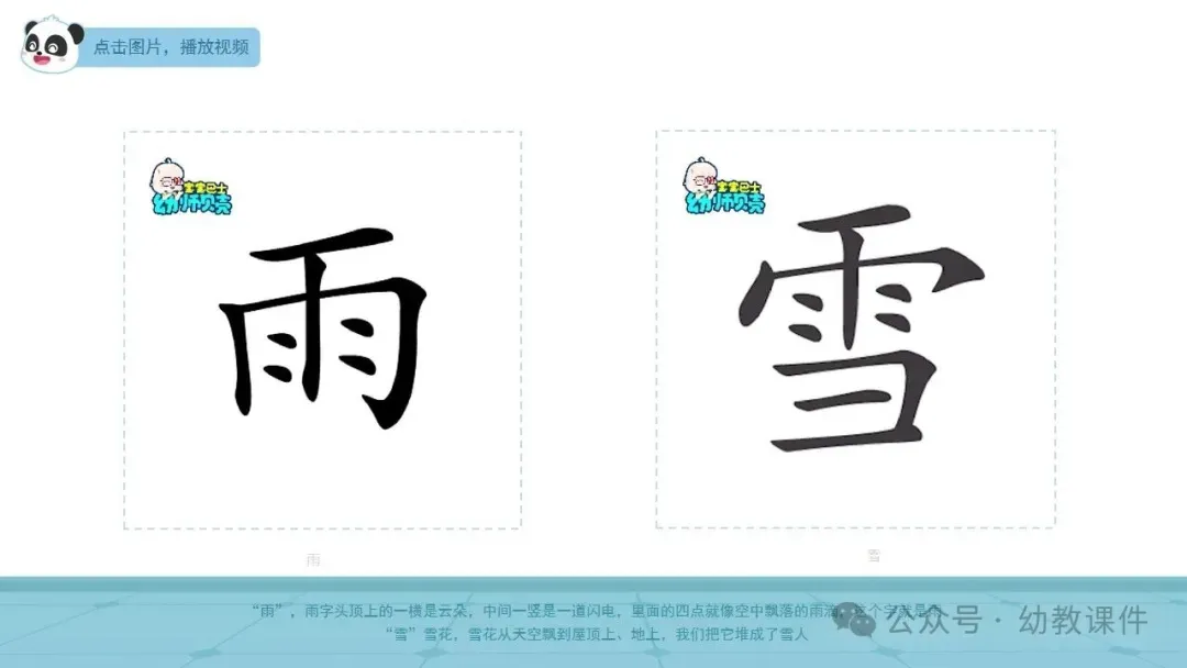 播放视频“汉字的演变”,引导幼儿认识汉字“晴、风、雨、雪”。