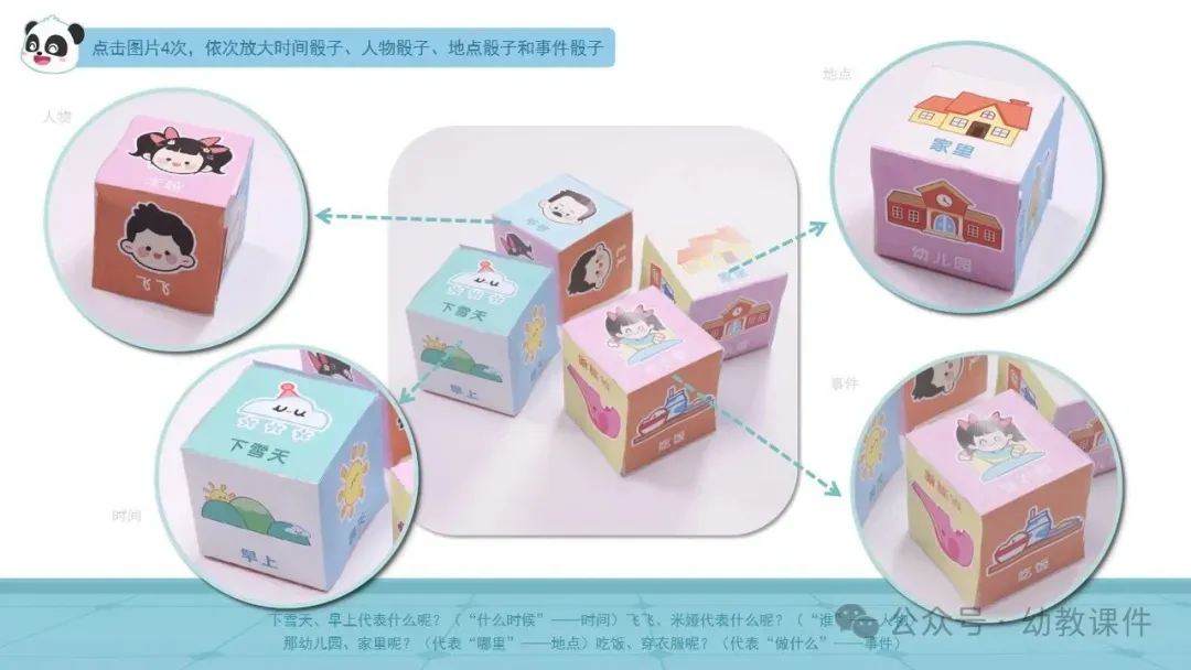 1.幼儿拿出分别为时间、人物、地点、事件的四个正方体。
