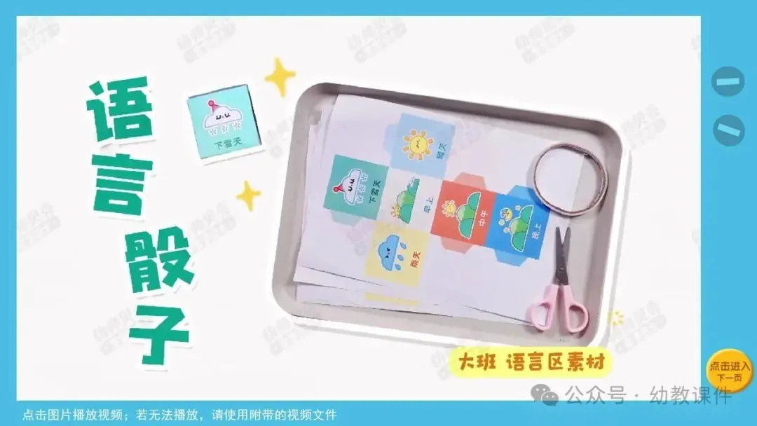 出示组图、操作材料和操作视频“语言骰子”,师幼共同总结游戏玩法。