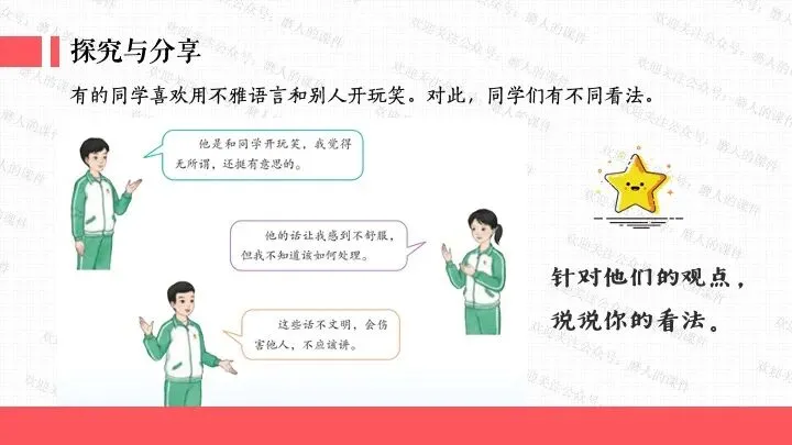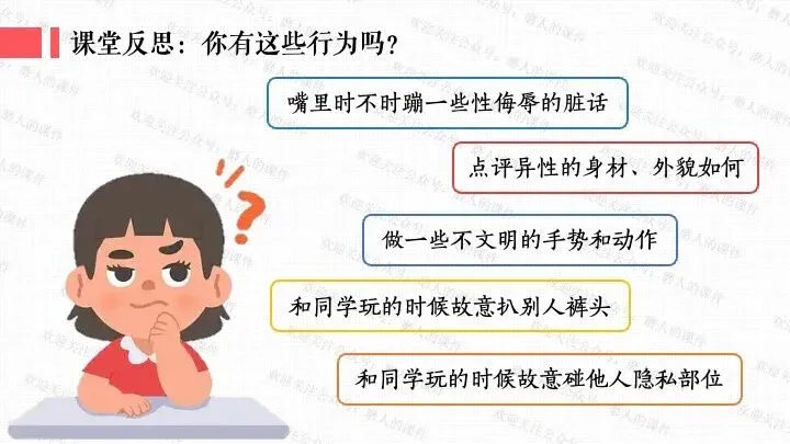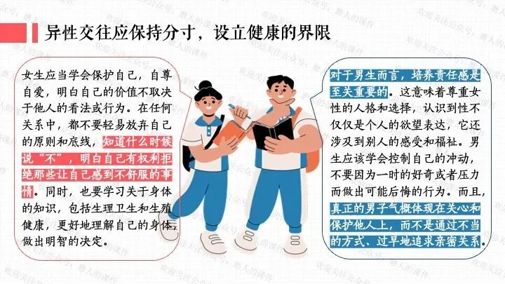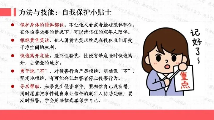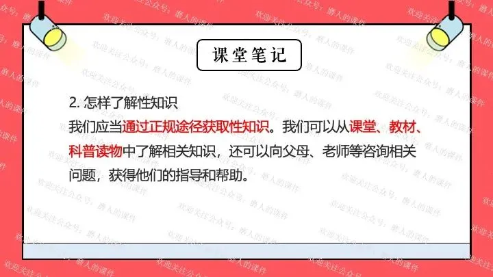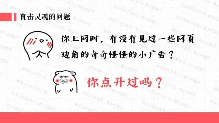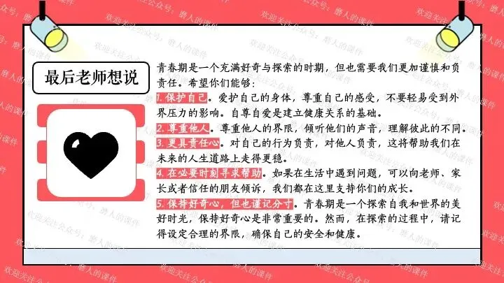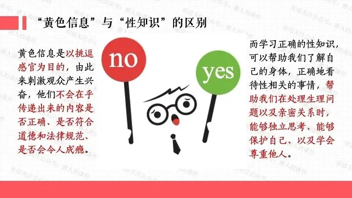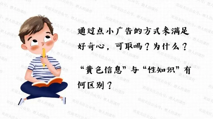 其实学生在上网过程中多少都会接触到相关信息,我以网页小广告的问题导入,直面生活;再通过相关系列问题、视频素材,树立正确的性知识理念;再通过探究与分享、实用技能分享、认清“无痛人流”、异性交往的合理界限等话题探讨,增强自我保护意识;最后呈现本课的知识框架以及教师走心寄语。课件逻辑清晰,素材丰富,兼具知识讲授和价值引导。