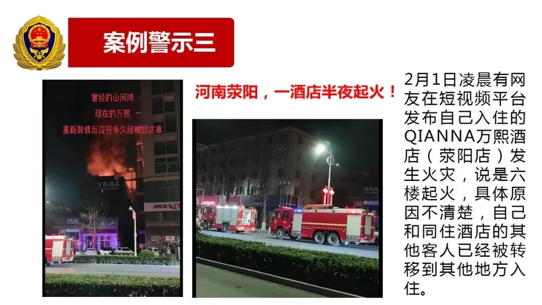 2月1日凌晨有网友在短视频平台发布自己入住的QIANNA万熙酒店(荥阳店)发生火灾,说是六楼起火,具体原因不清楚,自己和同住酒店的其他客人已经被转移到其他地方入住。