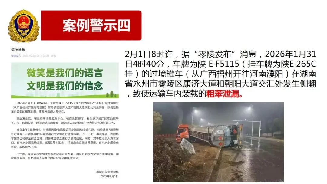 2月1日8时许,据“零陵发布”消息,2026年1月31日4时40分,车牌为陕 E·F5115(挂车牌为陕E·265C挂)的过境罐车(从广西梧州开往河南濮阳)在湖南省永州市零陵区康济大道和朝阳大道交汇处发生侧翻,致使运输车内装载的粗苯泄漏。