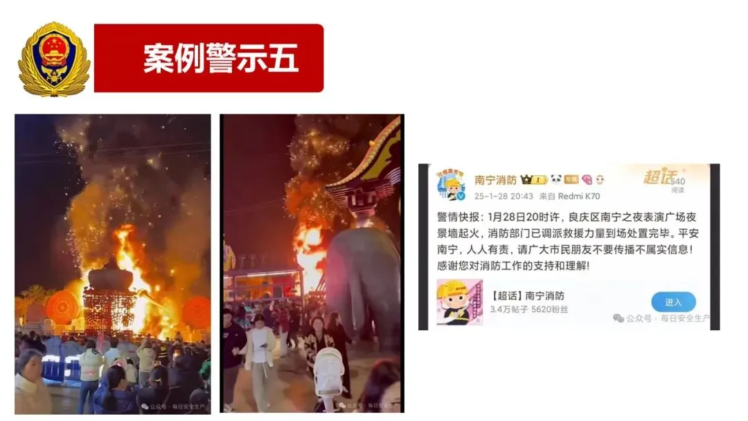 1月28日20时许,良庆区南宁之夜表演广场夜景墙起火,消防部门已调派救援力量到场处置完毕。平安南宁,人人有责,请广大市民朋友不要传播不属实信息!感谢您对消防工作的支持和理解!