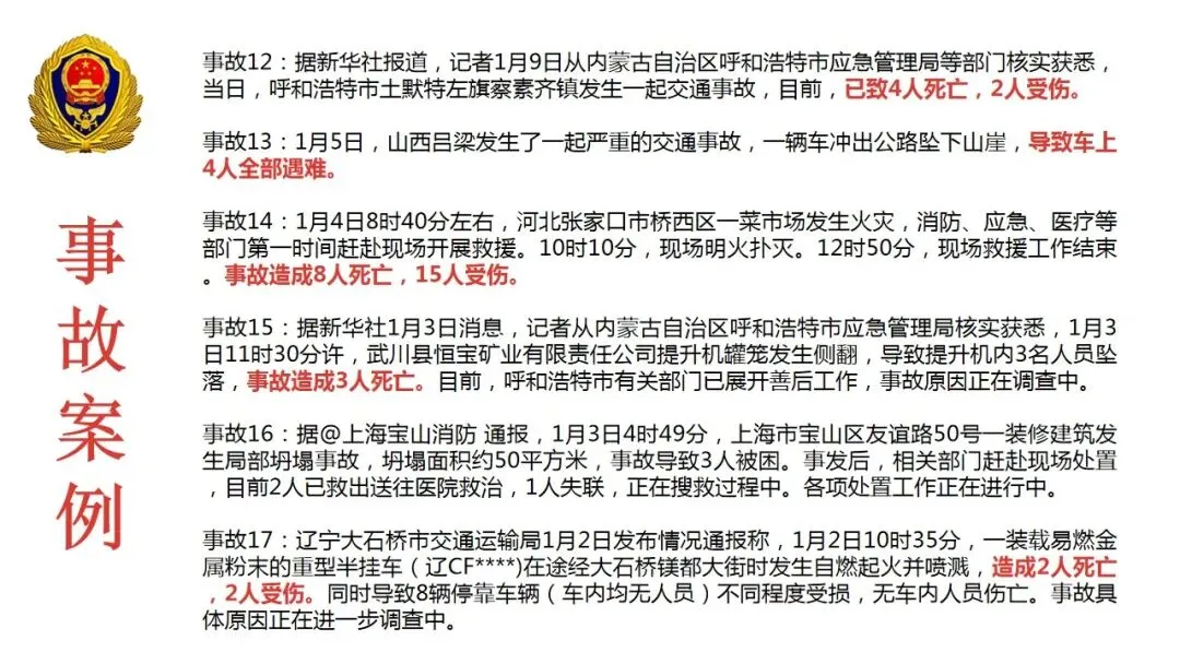 事故12:据新华社报道,记者1月9日从内蒙古自治区呼和浩特市应急管理局等部门核实获悉,当日,呼和浩特市土默特左旗察素齐镇发生一起交通事故,目前,已致4人死亡,2人受伤。