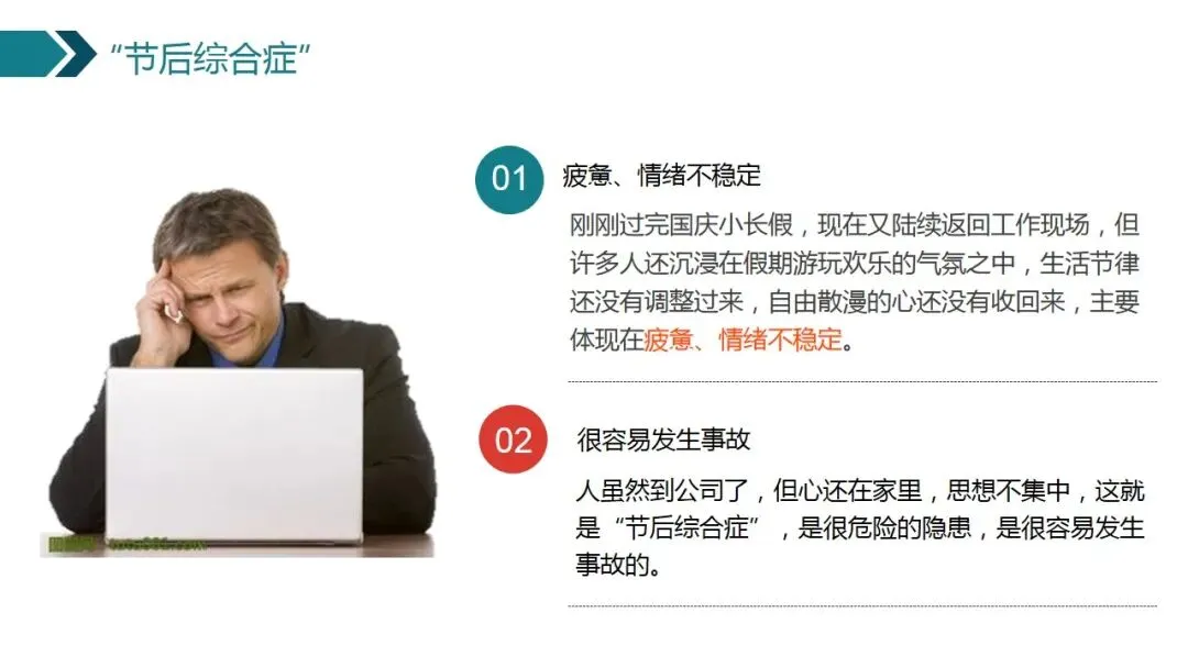 人虽然到公司了,但心还在家里,思想不集中,这就是“节后综合症”,是很危险的隐患,是很容易发生事故的。