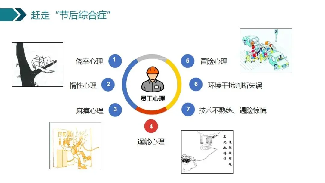 3.麻痹心理:源于对假期放松状态的过度依赖。经历了长假的休闲,人们的神经从紧绷状态突然放松,返工后难以快速集中注意力,对工作中的风险信号变得迟钝。看到熟悉的设备、常规的作业内容,便放松了警惕,认为“一切尽在掌握”,不再重视安全警示、操作规范。