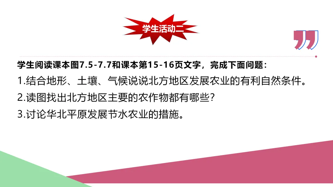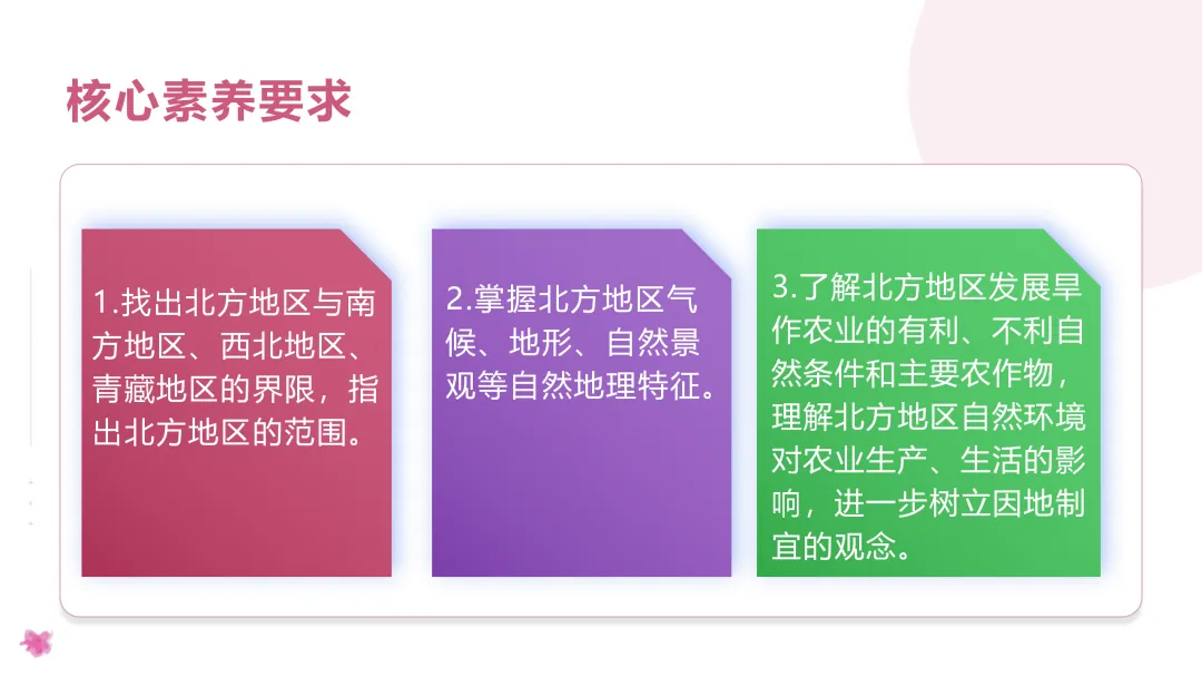 本课的教学对象是八年级学生,通过上册地理的学习,学生对中国地理已经有了一定的了解和知识运用,并具备了一定的地理思维能力和读图能力。因此本节课的学习需要注重对上学期所学内容的回顾,将上学期所学知识迁移到本节课的学习中来。在教学中应以学生为主体,利用课堂探究活动充分调动学生,让学生动起来,剖析自然环境的相应知识并平稳过渡到北方地区与其农业相互关系上来。最终使学生掌握区域地理的学习方法,为后面其他章节的区域地理学习打下基础。