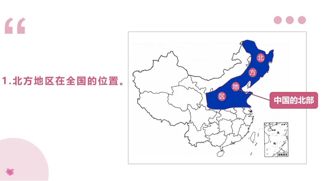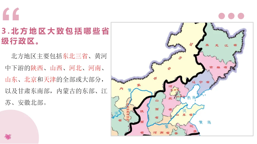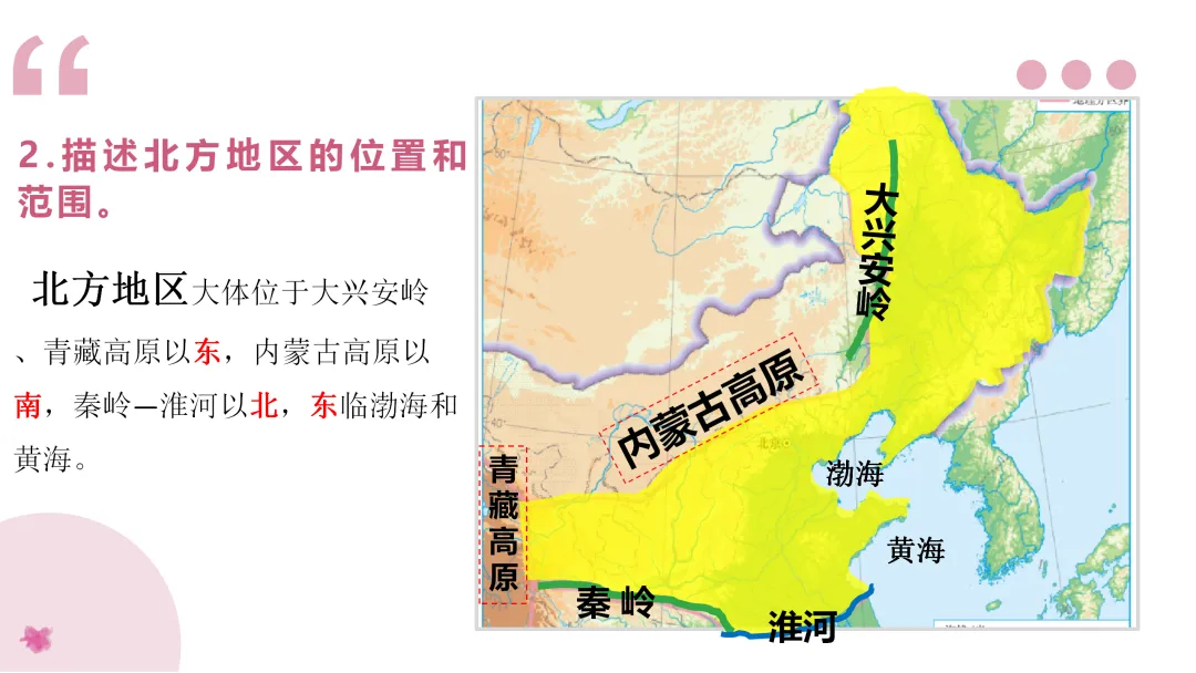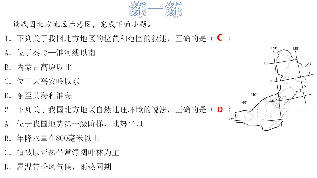 1. 读图描述北方地区的位置、范围。