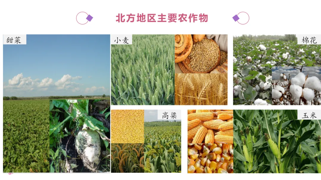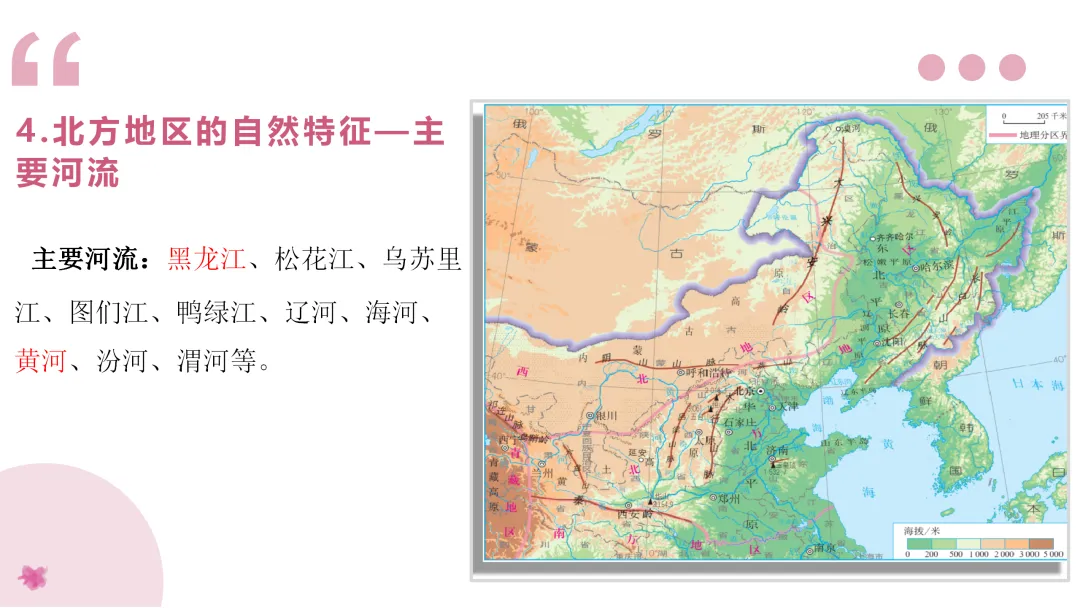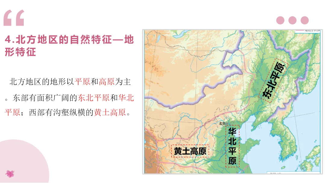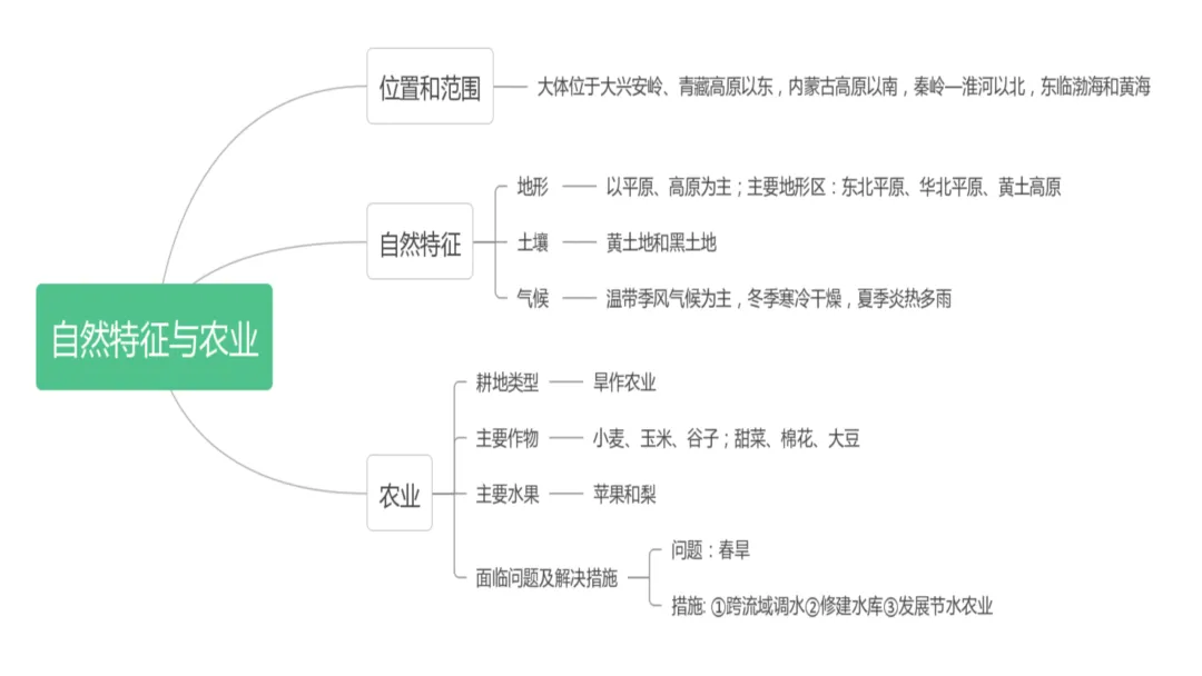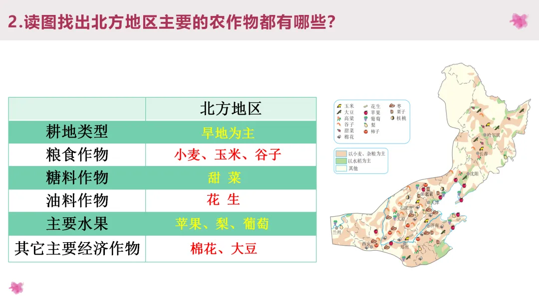 1. 利用地图识记北方的主要山脉、河流、地形区,了解农业特色。