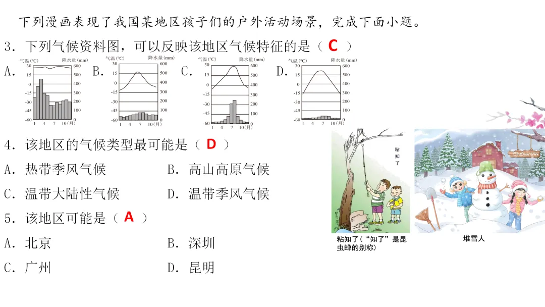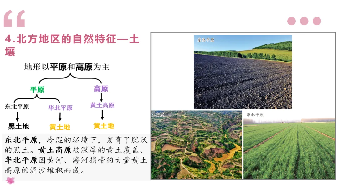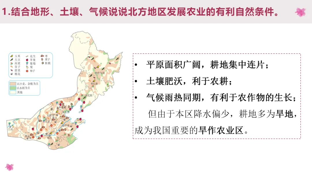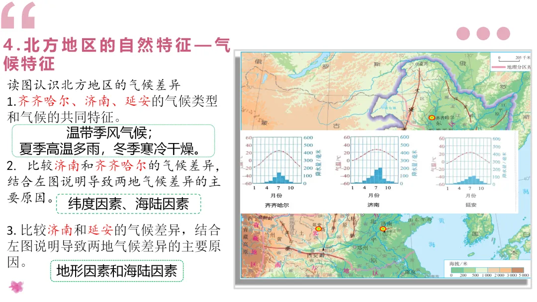 3. 阅读齐齐哈尔、石家庄和延安的气温和降水图,总结北方地区的气候类型和气候特点,阅读课文了解土壤特点,分析气候与土壤对农业的影响。