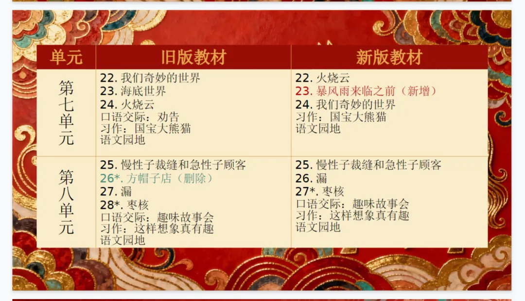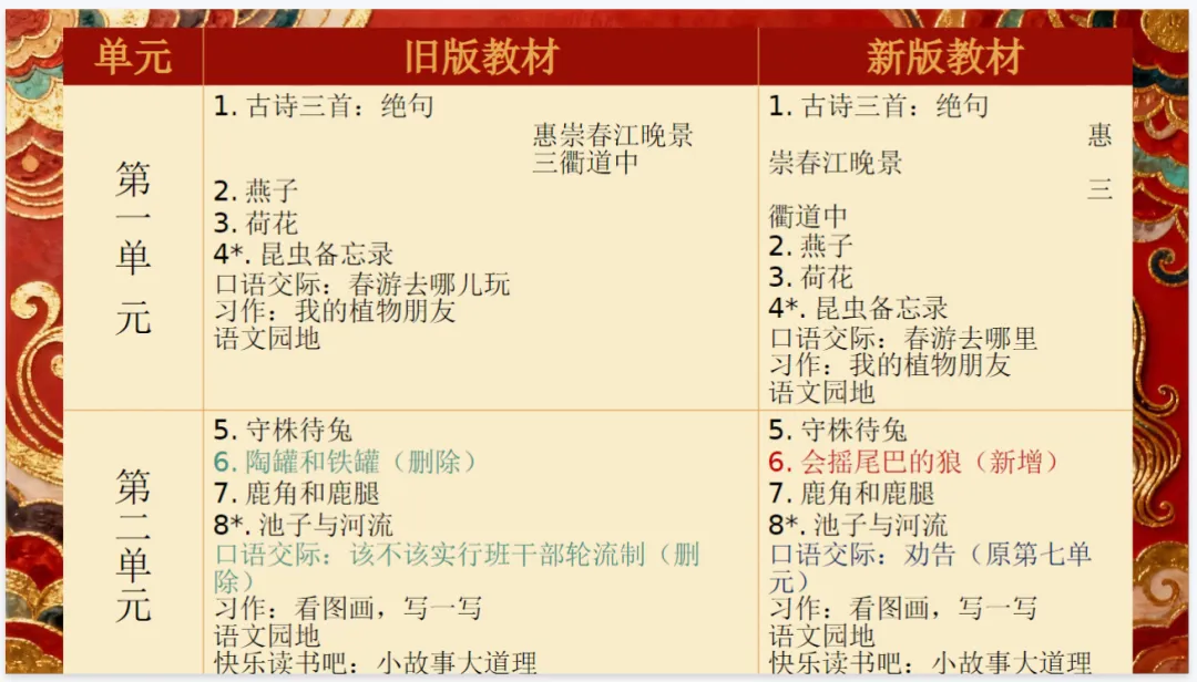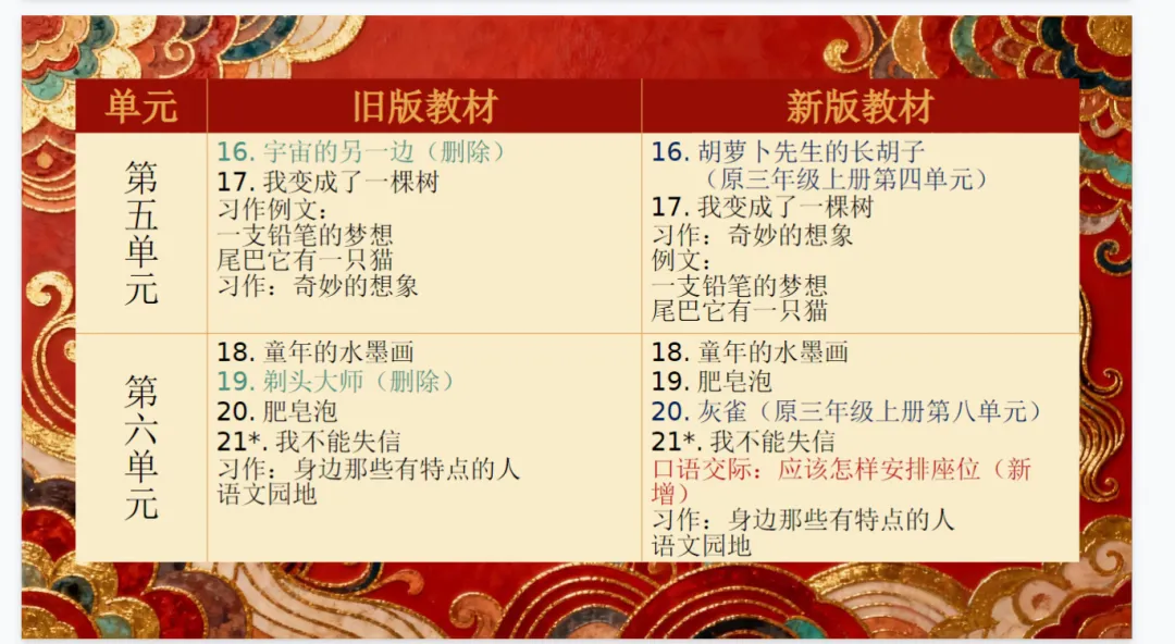 - 篇目增删:新增 4 篇课文(《会摇尾巴的狼》《胡萝卜先生的长胡子》《灰雀》《暴风雨来临之前》),删去 5 篇旧课文(《陶罐和铁罐》《花钟》《宇宙的另一边》《剃头大师》《方帽子店》),