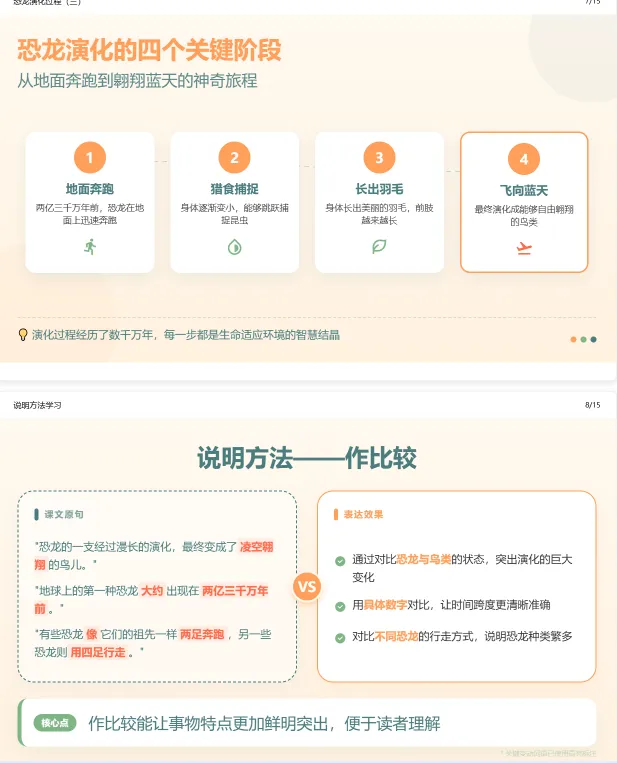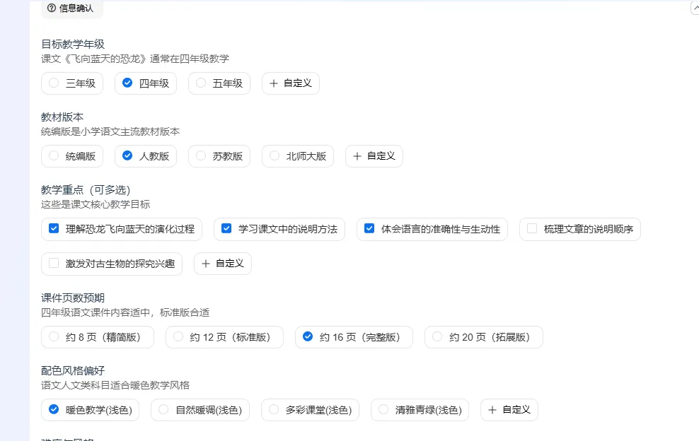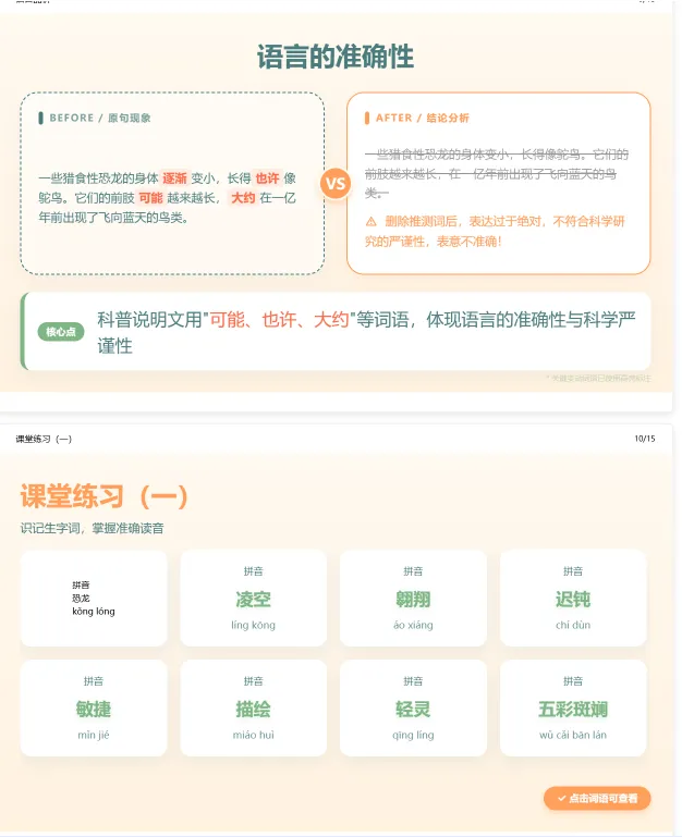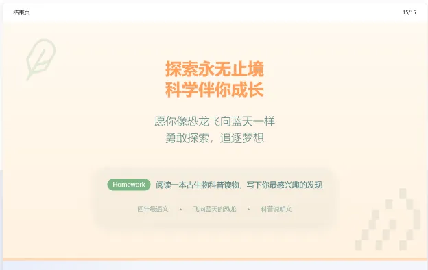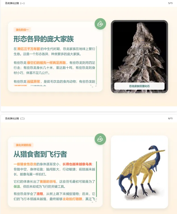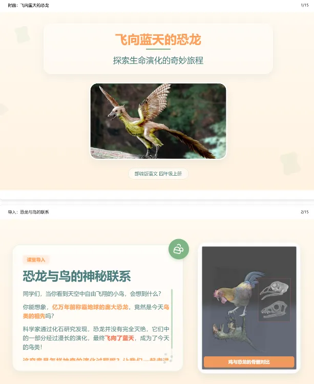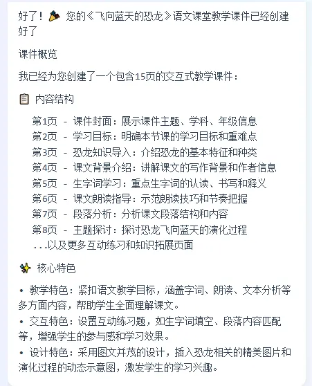 亲爱的老师们,你们好呀!今天想跟你们分享一款特别懂咱们一线教师的“智能小助手”——九章爱学老师版(原“老师帮”),一句话就能生成完整课件的工具。它就像一位贴心的教学伙伴,能帮咱们把备课、上课、批改作业这些日常工作中的“大工程”变得轻松又高效。你只需要用平常说话的方式告诉它你的想法,比如“帮我做一个平行四边形面积推导的动态课件”,它就能立刻生成一个图文并茂、带动画演示的专业课件,让那些抽象的知识点变得直观又生动,把咱们从繁琐的动画制作和PPT设计中解放出来。具体教程请看:我选择的是生成完整课件,以小学四年级语文下册的《飞向蓝天的恐龙》为例,提示词是:请生成一份讲解《飞向蓝天的恐龙》语文课堂教学课件,适合小学四年级学生理解