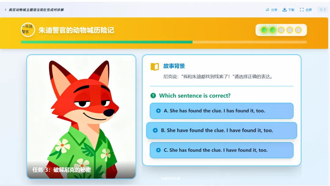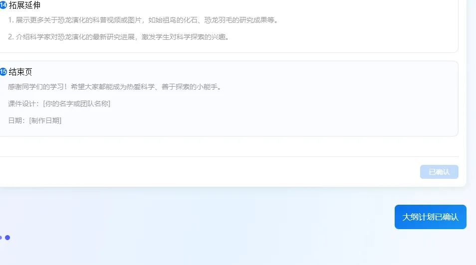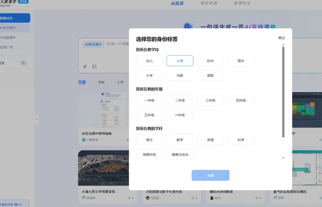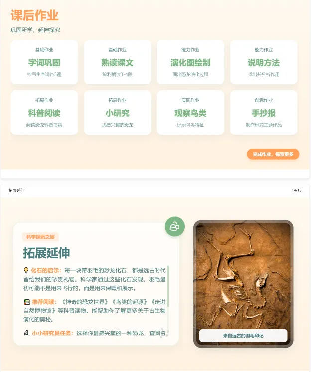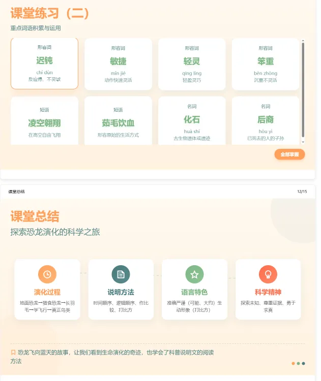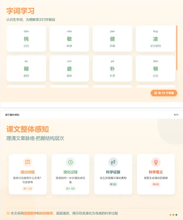 亲爱的老师们,你们好呀!今天想跟你们分享一款特别懂咱们一线教师的“智能小助手”——九章爱学老师版(原“老师帮”),一句话就能生成完整课件的工具。它就像一位贴心的教学伙伴,能帮咱们把备课、上课、批改作业这些日常工作中的“大工程”变得轻松又高效。你只需要用平常说话的方式告诉它你的想法,比如“帮我做一个平行四边形面积推导的动态课件”,它就能立刻生成一个图文并茂、带动画演示的专业课件,让那些抽象的知识点变得直观又生动,把咱们从繁琐的动画制作和PPT设计中解放出来。具体教程请看:我选择的是生成完整课件,以小学四年级语文下册的《飞向蓝天的恐龙》为例,提示词是:请生成一份讲解《飞向蓝天的恐龙》语文课堂教学课件,适合小学四年级学生理解