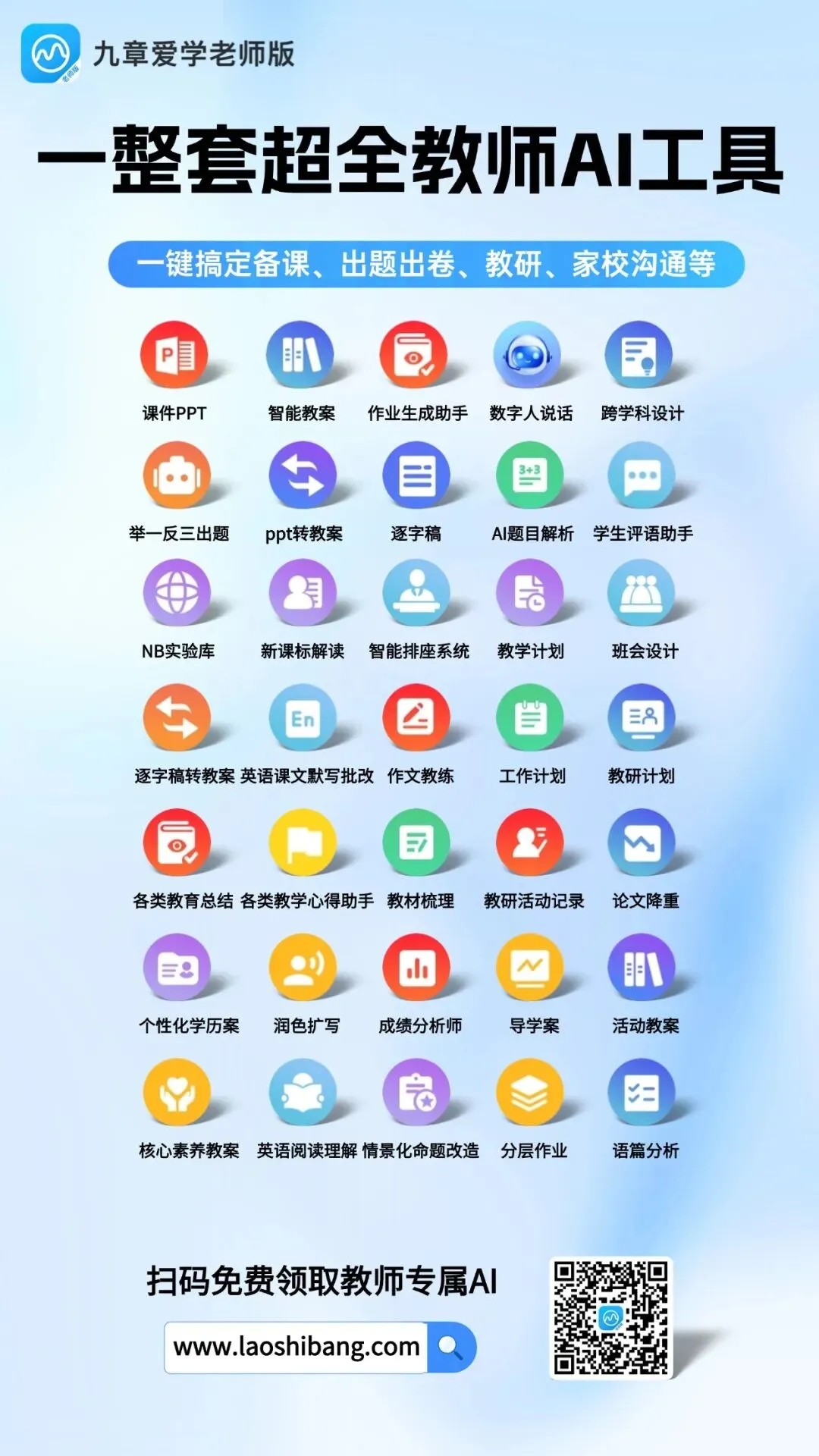 这么好的工具不会一直免费,这个是有免费对话每日30次的,趁着还没开学,赶紧用起来吧! 不仅如此,它还有超过170个智能小工具,覆盖了从“PPT转教案”、“智能组卷”到“班级积分榜”、“高情商回复”等方方面面,无论是设计跨学科课程、布置分层作业,还是管理班级、与家长沟通,它都能助你一臂之力。最棒的是,它还能和学生的应用联动,让咱们能实时看到班级的作业情况和学情数据,及时发现大家的共性问题,调整教学策略,形成一个完整的教学闭环。有了它的帮助,咱们就能把更多宝贵的时间和精力,投入到更有创造性的教学设计和与孩子们的心灵交流中去啦。除了课件之外,还有以下功能,太全面了!扫码还能领三天的免费会员,老师们这羊毛得薅起来!新学期伊始,希望这位AI教学助手能成为大家的得力伙伴,让我们一起拥抱技术,让教学更轻松,让课堂更精彩,共同探索教育的美好未来!祝各位老师新学期工作顺利,桃李芬芳!