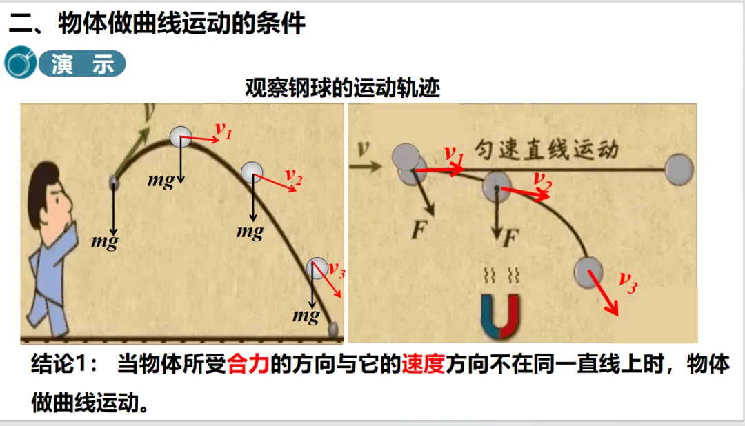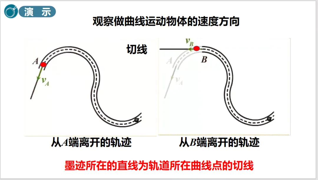 本节内容是本章教学的知识基础。在教学中,首先要让学生熟悉物体做曲线运动的情景。生活中又有许多的例子,让学生去观察,体验,缩短物理知识与学生之间的距离,建立学生对物理科学的亲近感。通过实验和讨论,让学生体会到做曲线运动的物体的速度是时刻改变的,曲线运动是变速运动,速度方向沿轨迹的切线方向。运用力和运动之间的关系,结合已有的模型,通过实验观察、联系实际、归纳总结、逻辑推理来解决问题,理解物体做曲线运动的条件。
