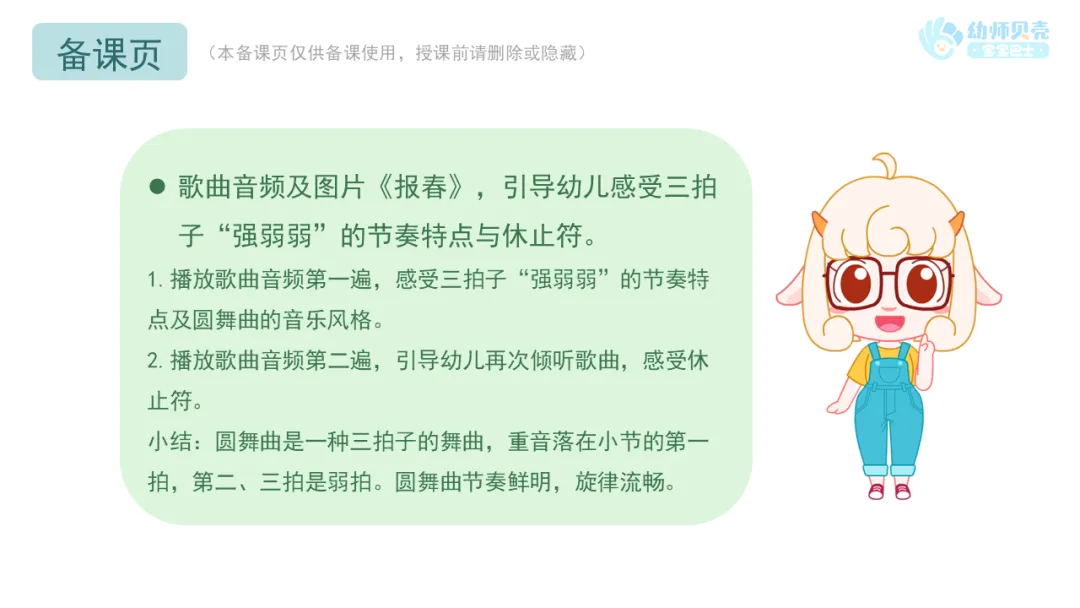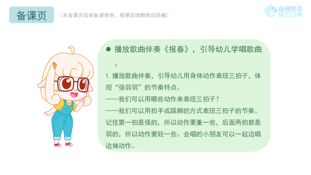 l播放歌曲音频及图片《报春》,引导幼儿感受三拍子“强弱弱”的节奏特点,学会唱准休止符。