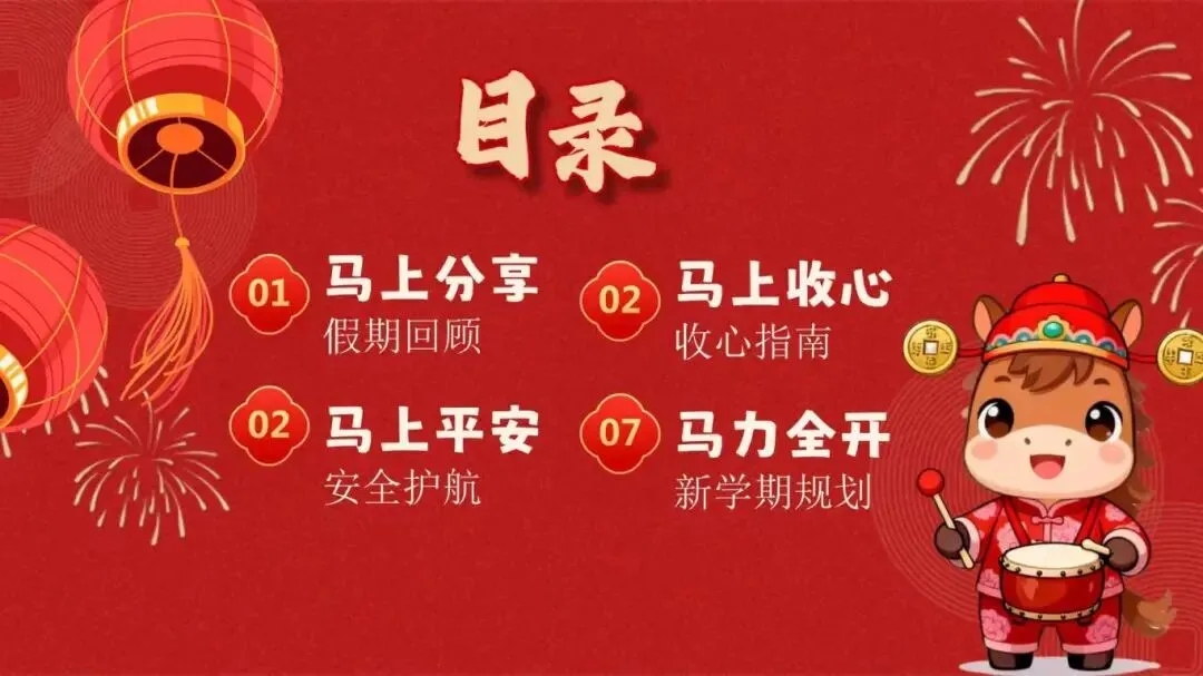嗨,我是君君妈妈!今日分享2026年春《开学第一课“马力全开”课件》电子版可编辑,完整版共39页,有发言稿。新学期将至,这份开学第一课,包括假期趣事、收心指南、安全护航和新学期规划,助力孩子们以昂扬姿态开启新学期征程!